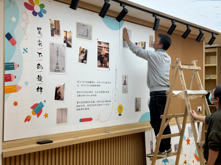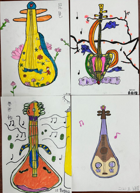 此外,为充分发挥我馆的教育功能,增强学生的学习自主能力和创新能力,达到沉浸式观赏和创意式参与的观展体验,还特别邀请了七色花小学的同学们参与展览相关活动,充分发挥同学们的特长。通过这种“参与式观展”的创新性尝试,同学们从局外的“观展人”,变成局内的“策展人”。用画笔勾勒自己对于民族乐器的奇思妙想,各种形制的乐器绵延成艺术的线条,鲜艳的色彩焕发出朝气蓬勃的新鲜生命力。