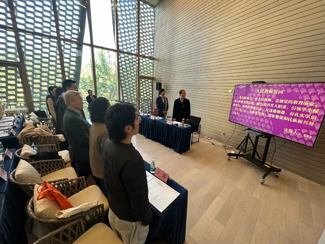陈晓翌带领全体新进教职工完成入职宣誓仪式,在庄严的誓词中表达忠诚党的教育事业,履行教书育人职责,为教育发展、国家繁荣和民族振兴努力奋斗的决心。新进教职工代表、管弦系刘铭老师和党委组织部范嘉茗老师作表态发言。