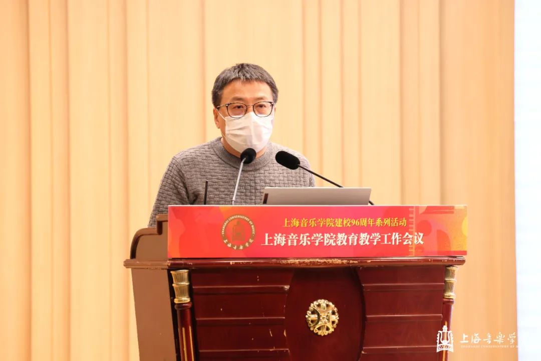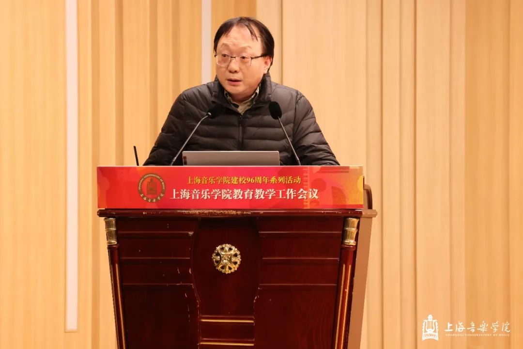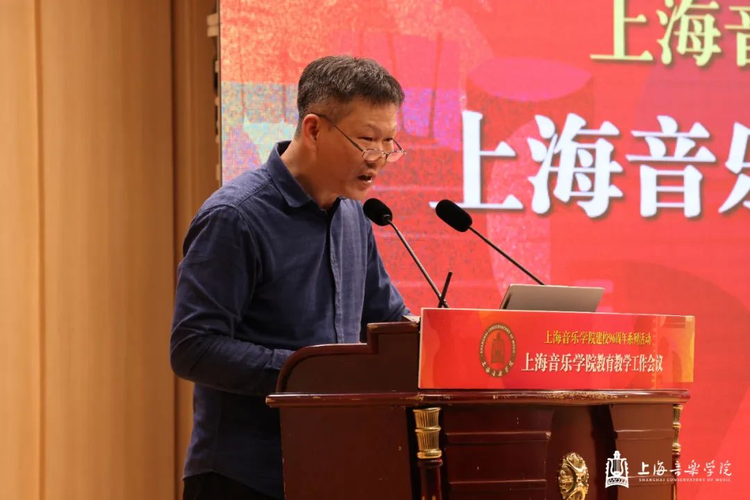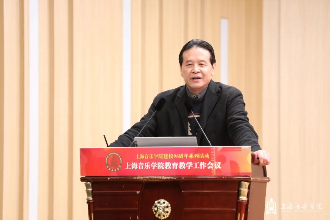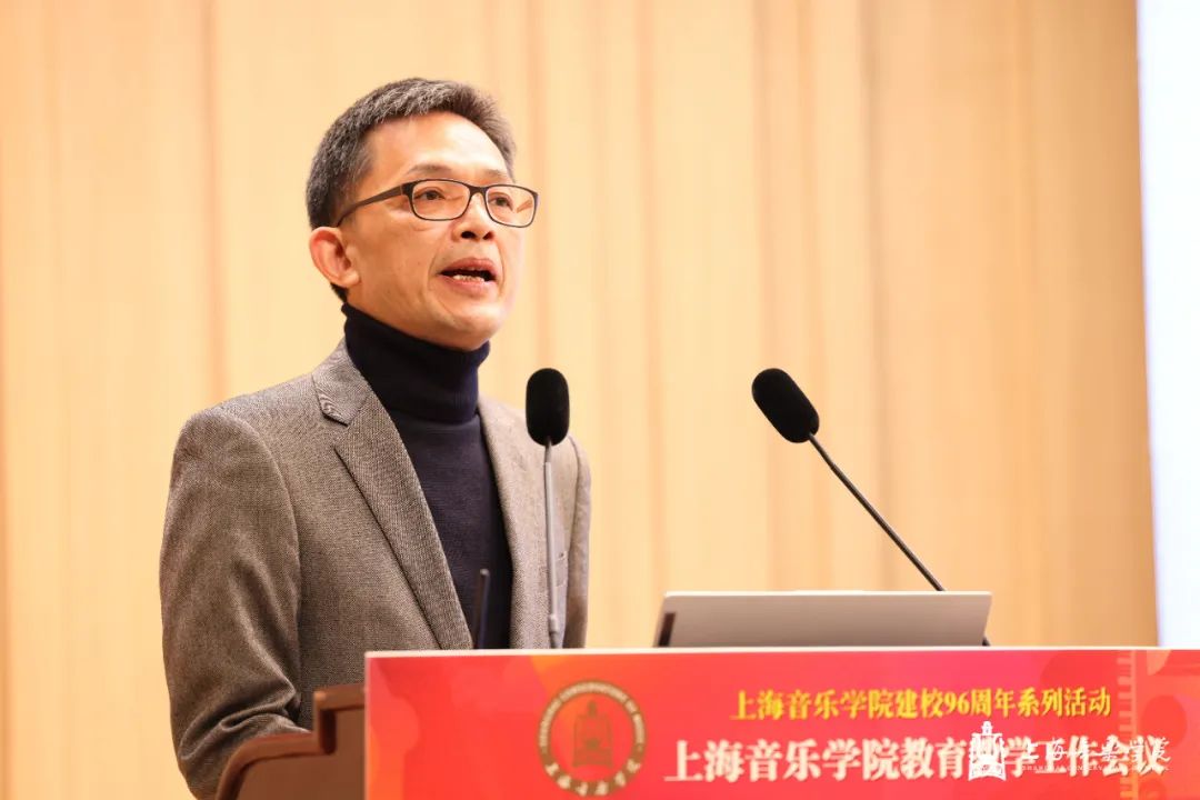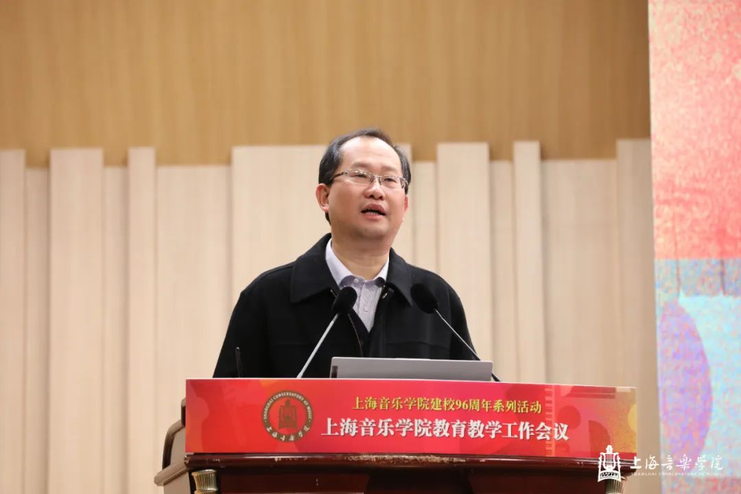 在第一天的本科教育教学会议上,教务处处长杨茹文作题为“新一轮审核评估视角下的本科教育教学内涵建设解析”工作报告,聚焦新一轮教育教学审核评估工作,从新一轮审核评估概念、新一轮审核评估核心工作、审核评估视角下的教学短板及未来工作重点四个方面进行汇报。大会还特邀华东师范大学教务处处长周先荣作题为“唯卓越方可立足——以评促建,以质量文化建设推动提升人才自主培养质量”的专题讲座。作曲指挥系主任周湘林、管弦系主任刘照陆作为二级院系代表进行了交流发言。