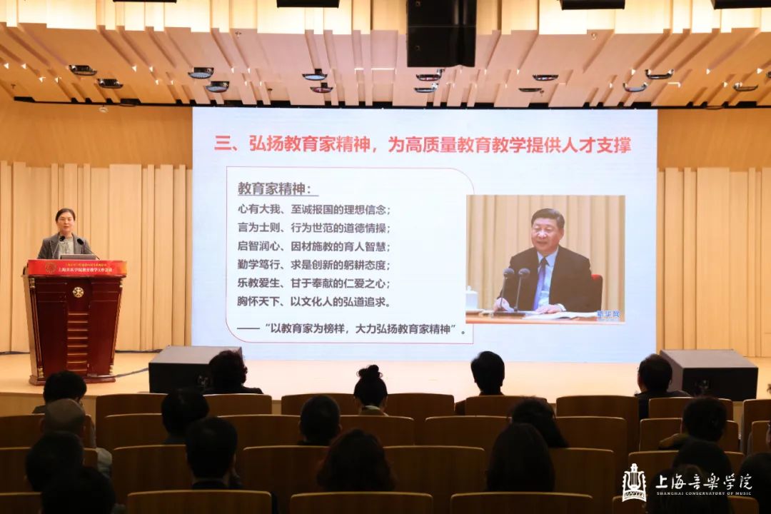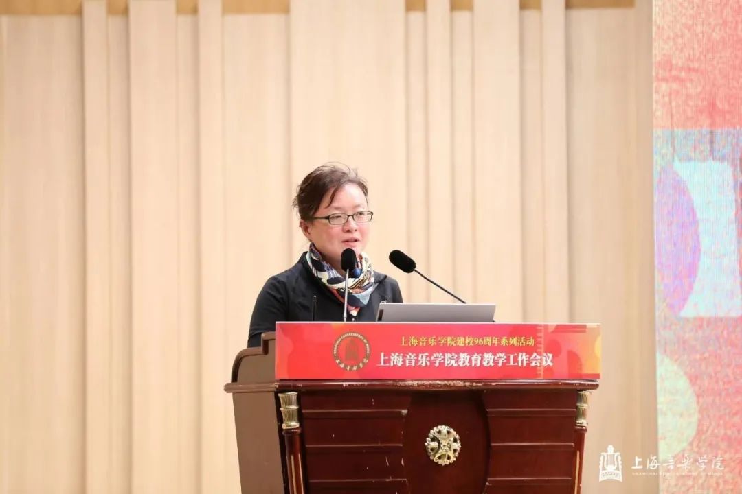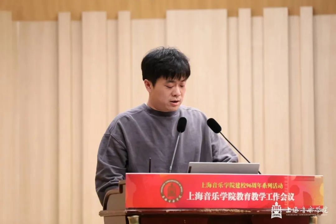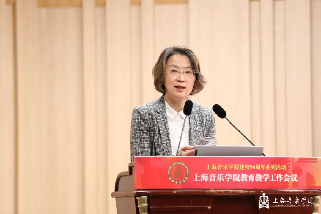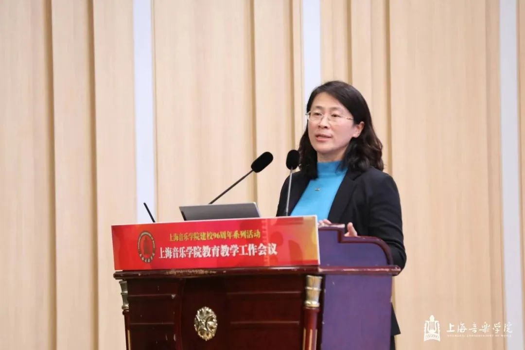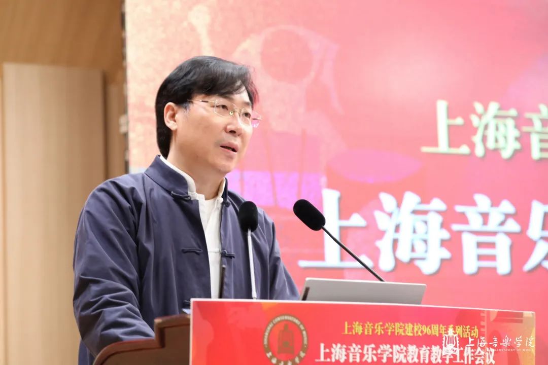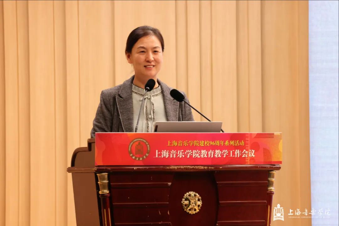 在第一天的本科教育教学会议上,教务处处长杨茹文作题为“新一轮审核评估视角下的本科教育教学内涵建设解析”工作报告,聚焦新一轮教育教学审核评估工作,从新一轮审核评估概念、新一轮审核评估核心工作、审核评估视角下的教学短板及未来工作重点四个方面进行汇报。大会还特邀华东师范大学教务处处长周先荣作题为“唯卓越方可立足——以评促建,以质量文化建设推动提升人才自主培养质量”的专题讲座。作曲指挥系主任周湘林、管弦系主任刘照陆作为二级院系代表进行了交流发言。