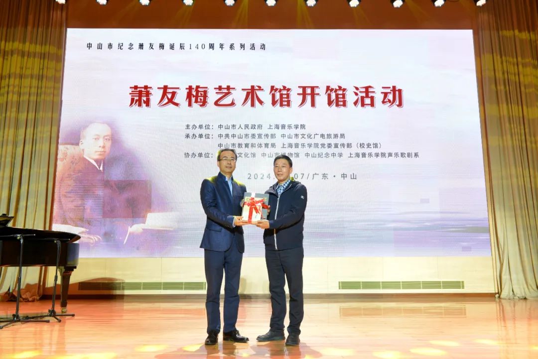 萧友梅艺术馆正式揭牌。吴学霆代表学校向中山纪念图书馆赠送了《萧友梅音乐作品手稿集》及《百年巨匠》上音系列丛书。随后,举办了一场萧友梅经典作品音乐会,精选了三首代表作《问》《秋思》和《南飞之雁语》,由我院声歌系硕士研究生刘哲携手上音校友黄迪、中山合唱团等现场演绎,共同感怀萧友梅先生的音乐魅力和精神力量。