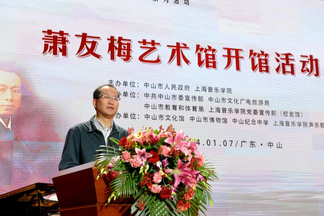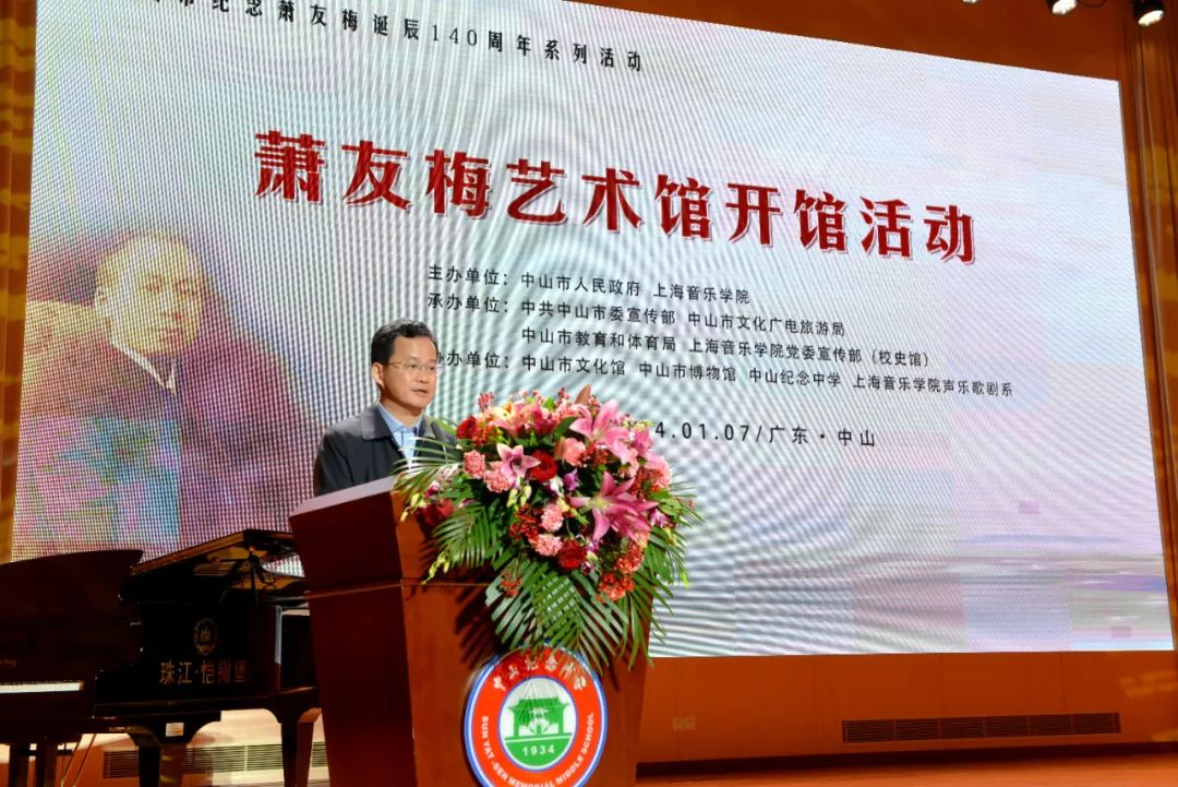 曹荣瑞在致辞中指出,萧友梅先生在办学中,一方面十分注重积极借鉴西方音乐院校成功经验,以系统、科学的现代教育制度和方法培养学生;另一方面十分注重保存中国古乐精华,利用前人文化遗产创造表达时代精神、国人情思的新国乐。新时代新征程,我们将坚持“不忘本来,吸收外来,面向未来”,传承萧友梅先生的教育理想、办学思想和教学理念,弘扬“和毅庄诚”的校训精神,秉持“出人才、出作品、出思想、出标准”的办学理念,以立德树人为根本任务,着力培养拔尖创新艺术人才,推动学校高水平办学、高质量发展、高品质开放,加快建成“中国特色、世界一流”的音乐高等学府,与中山市进一步加强务实合作,为建设教育强国和文化强国贡献智慧和力量。