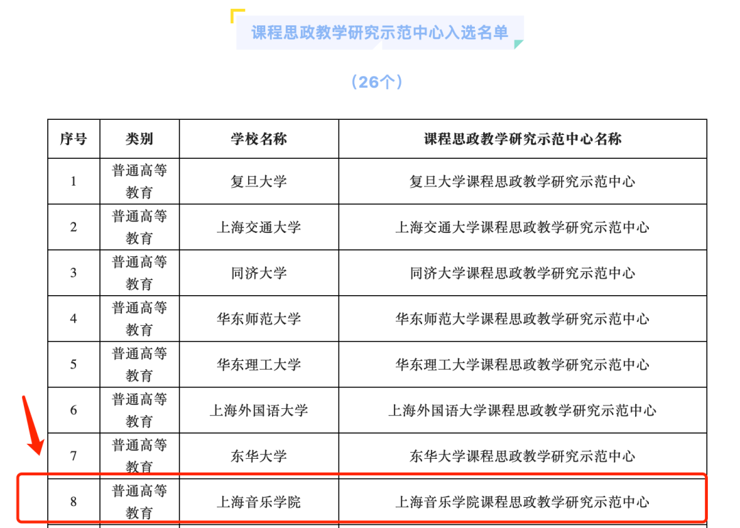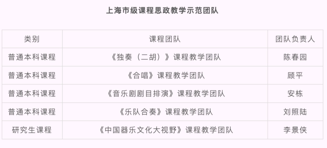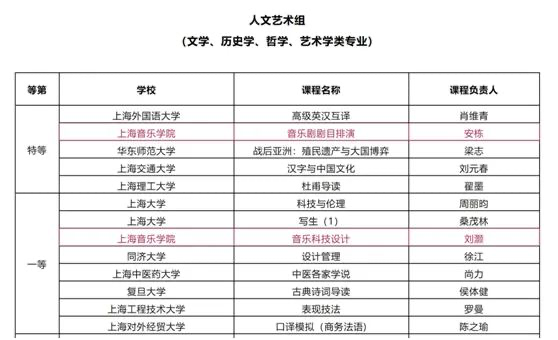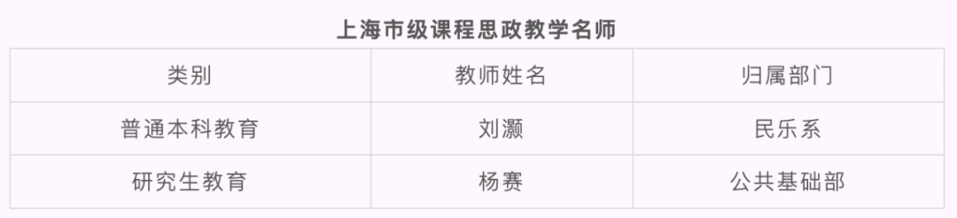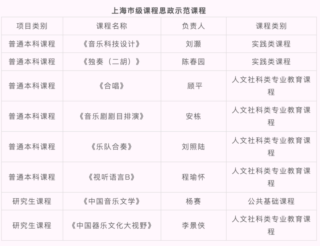 2022年,学校获批上海市课程思政教学研究示范中心。“建设行走的音乐思政”获上海市教学成果奖(思政)一等奖;3门课程分别获首届上海市课程思政教学设计展示活动特等奖、一等奖、二等奖;8门课程获批市级课程思政示范课程;5个团队获批市级课程思政教学示范团队;2位教师获评市级课程思政教学名师;1名教师获第三届“上海市高校青年教师培养资助计划”特等奖;《艺术教育与思政教育有机融合研究》课题获2022年度国家社科基金高校思想政治理论课研究专项立项;《音乐党课》《行走的音乐思政》2个项目获2023年度上海市教育科学研究项目“上海高校哲学社会科学研究专项”立项;6个项目入选上海高校“时代新人铸魂工程”培育项目;3门课程入选2023年度上海高校市级一流本科课程;5个作品获全国高校网络作品奖项;17个作品获上海高校网络作品奖项;3项成果获上海哲学社会科学优秀成果奖二等奖;2个项目入选上海市马克思理论学科发展支持计划;率先打造“大中小幼社”15分钟思政育人实践圈等。