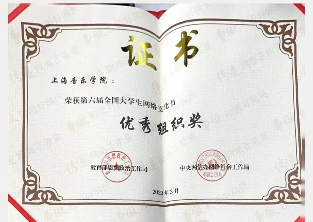 同时,学校积极加强高校网络思政功能,不断探索和完善思想政治工作新途径新方法,在由教育部思想政治工作司、中央网信办网络社会工作局主办的第六届“全国大学生网络文化节”遴选活动中,上音获得第六届大学生网络文化节“优秀组织奖”的荣誉。