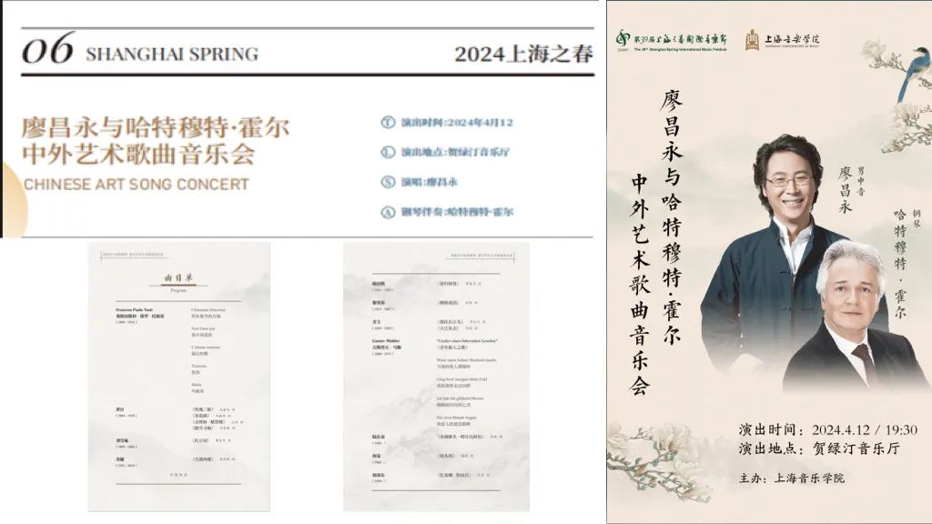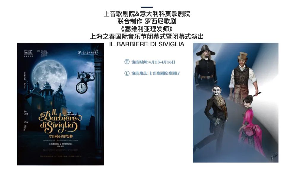 申城观众与音乐爱好者将欣赏到精彩的国际交流演出项目,上海之春音乐节闭幕演出剧目:上海音乐学院与意大利科莫歌剧院联合制作罗西尼歌剧《塞维利亚的理发师》,把原汁原味的经典歌剧搬上上音歌剧院舞台。德国室内乐大师拉尔夫·哥托尼(Ralf Gothoni)将领衔五位来自欧洲的音乐家举办室内乐音乐会 ,带来经典曲目德沃夏克的《钢琴三重奏 “杜姆卡”》和舒伯特的《A大调钢琴五重奏“鳟鱼”》 。4月12日,廖昌永将联袂著名合作钢琴艺术家哈特穆特·霍尔教授,推出《中外艺术歌曲音乐会》,这也是上海音乐学院连续6年在“上海之春”国际音乐节举办“上音艺术歌曲学术品牌”系列音乐会。