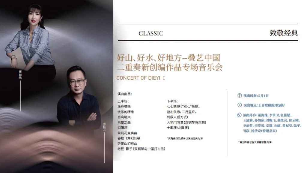 4月,春季演出季将举办《“芬芳千古”纪念闵惠芬大师二胡音乐会》,此外,上音詹永明、霍永刚教授也将领衔呈现竹笛与二胡主题的音乐会。钢琴艺术板块,叠艺中国二重奏将举办“好山、好水、好地方”新创编中国作品专场音乐会等。