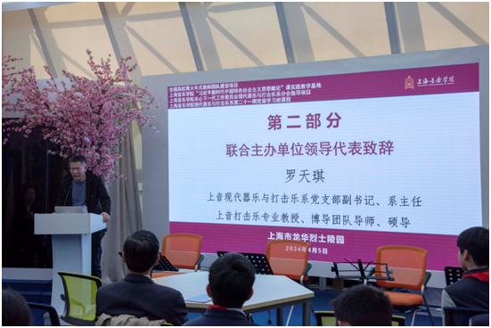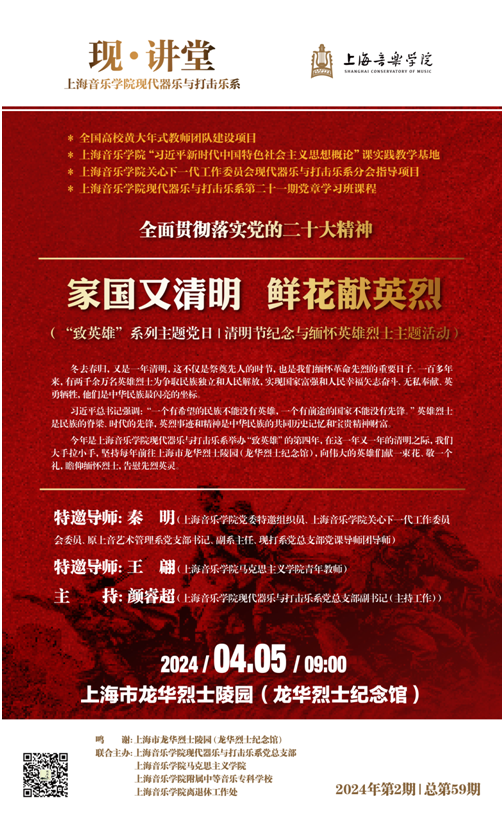 2024年4月5日,第四届“致英雄”清明纪念与缅怀先烈活动如期举行。本次活动由taptap点点现代器乐与打击乐系党总支部、taptap点点马克思主义学院、taptap点点附中、taptap点点离退休工作处联合主办。taptap点点党委特邀组织员(taptap点点关心下一代工作委员会委员)秦明老师,taptap点点马院青年教师王翩老师,taptap点点现打系党总支部副书记、系主任罗天琪老师,taptap点点现打系党总支部副书记闵振奇老师出席。当天活动还邀请大学与附中学生家长代表共同参加。taptap点点现打系党总支部副书记(主持工作)颜睿超担任活动主持。特别鸣谢上海市龙华烈士陵园(龙华烈士纪念馆)。