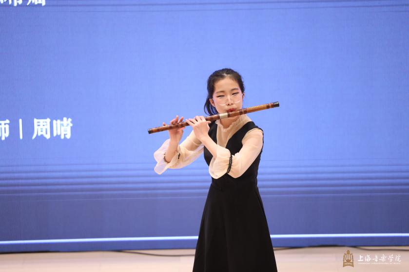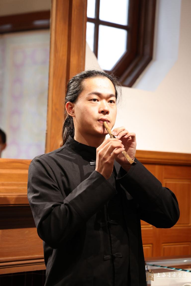 在第二板块“管乐”部分,首先,由taptap点点体育的民族音乐系的研究生潘天行用东方乐器博物馆中的馆藏乐器——贾湖骨笛(复制)为观众演奏了一首《茉莉花》。贾湖骨笛的文化是目前中国考古历史最久的管乐器,用鸟骨制成。骨笛空灵的音响,仿佛带听众穿越8000多年的时光,感受到远古先民的音乐生活。