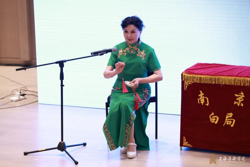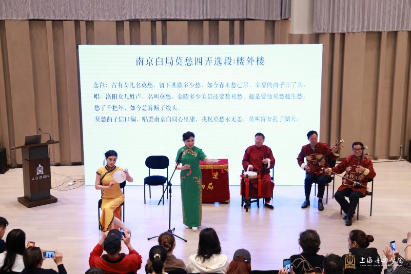 本次讲座特邀评弹演员陆锦花和南京白局“福享松年”艺术团,共同为观众展现长江三角洲曲艺音乐的独特魅力。南京白局作为南京地区的古老曲种,至今已有700多年的历史,是一种极具地方特色的说唱艺术。南京白局“福享松年”艺术团为观众现场演绎了《王老头配茶壶盖儿》《十二月花》《莫愁四弄选段:楼外楼》。