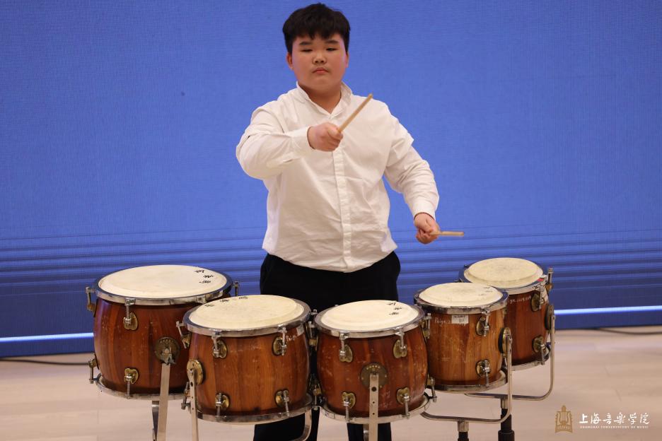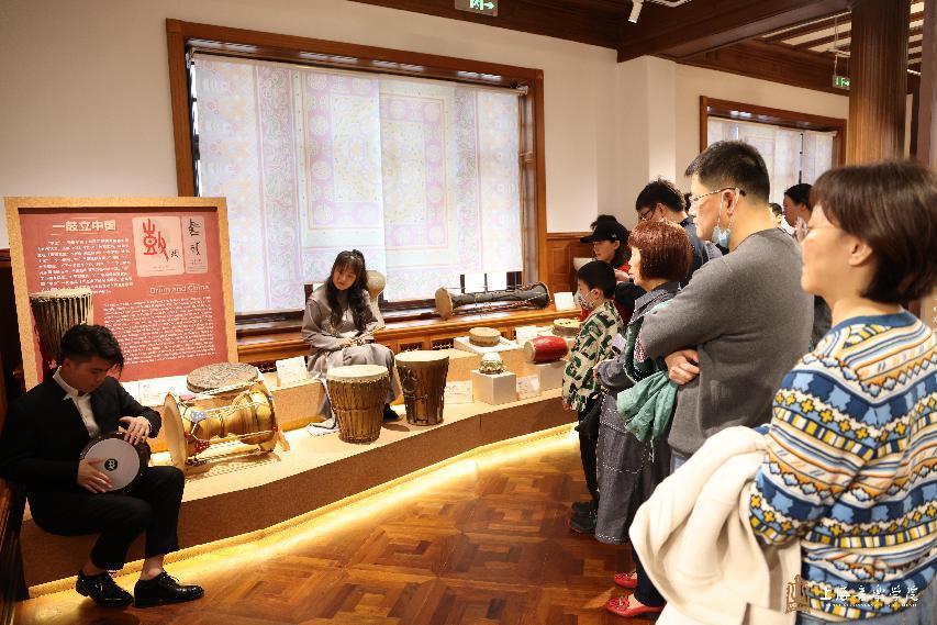 序曲声落,展厅大门缓缓开启,观众随着邢老师的步伐进入“鼓乐”区域,观众了解了鼓在古代民间及军事活动中具有重要作用,并且与人民的信仰、仪式乃至与“中国”二字的关联。张童欣、王艺桑二人用埃及鼓和纳格拉鼓为大家带来打击乐对奏《中·鼓·秀》。“让藏品发声”是此次音乐会的亮点。此曲用的纳格拉鼓即东方乐器博物馆的藏品,也是此次展览的展品之一,来自新疆维吾尔族刀郎木卡姆使用的乐器。