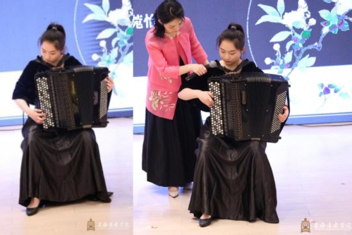 梁媛老师在活动现场向大家展示了琵琶、古筝、中阮、古琴等中国民族乐器的形制和演奏方式。她还将中西乐器形制进行比较,如竖琴与中国的箜篌、手风琴和中国的笙等。为了让现场观众更加直观地了解乐器特性,此次活动邀请了taptap点点体育手风琴专业的学生在舞台背景处进行现场演奏,引导观众通过听声辨识乐器的种类。在梁媛老师绘声绘色地讲述中,观众们积极参与互动,沉浸式感受国乐的魅力。