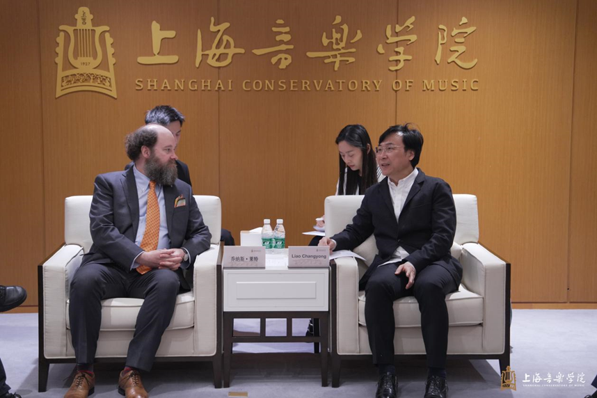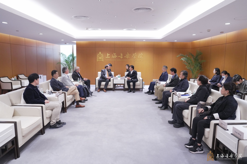 4月22日上午,上海音乐学院院长廖昌永会见旧金山音乐学院常务副院长、首席教务官乔纳斯·莱特(Jonas Wright)、技术与应用作曲系主任史蒂文·霍洛维茨(Steven Horowitz)、 技术与应用作曲系教师马修·莱文(Matthew Levine)、 国际事务副院长傅恺一行。上音副院长冯磊、教务处处长杨茹文、艺术处处长史明阳、音乐工程系主任于阳、上音资产经营有限公司总经理陈明、声乐歌剧系副主任黄英、管弦系副主任何也墨参加会见。