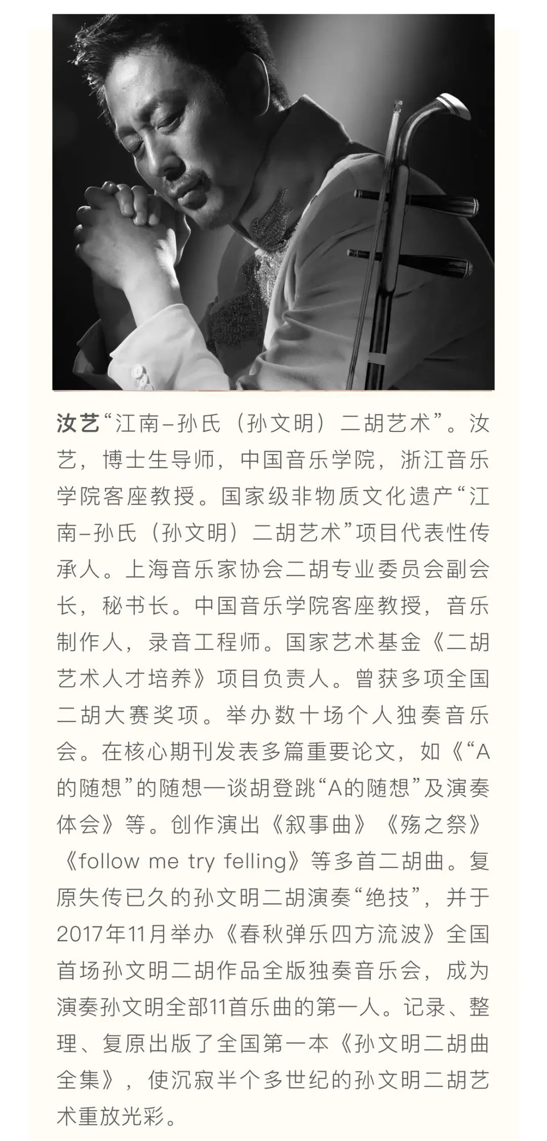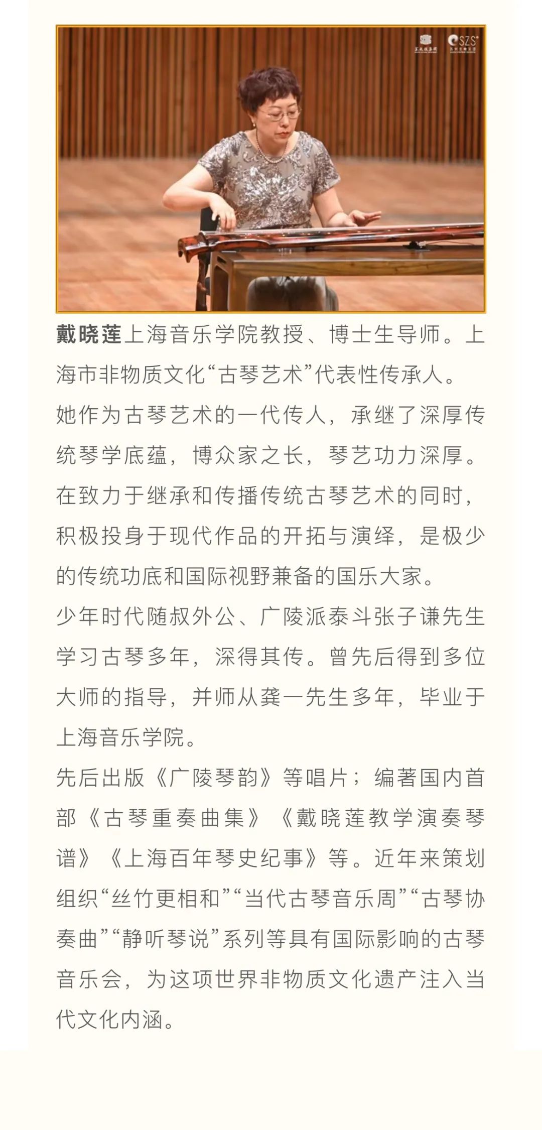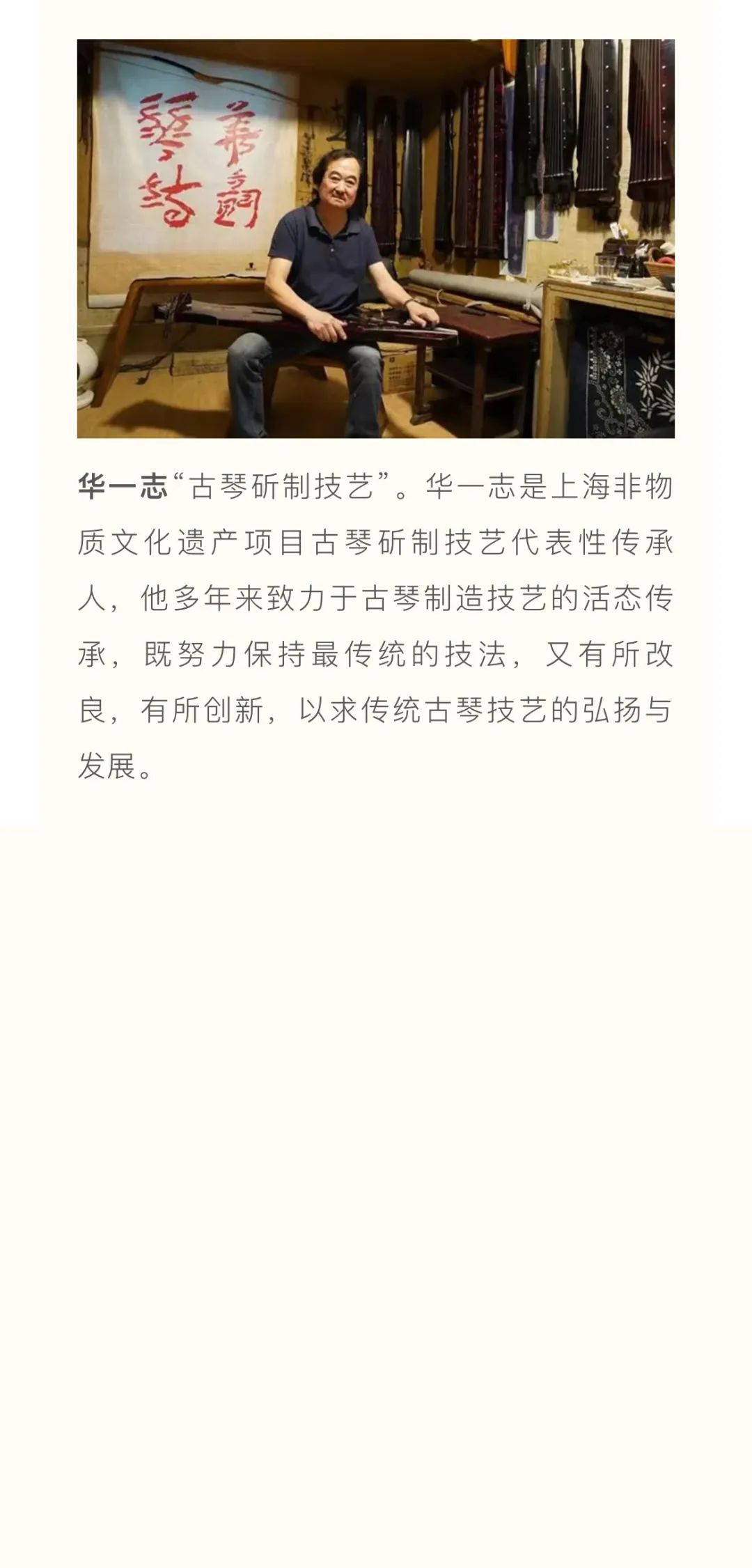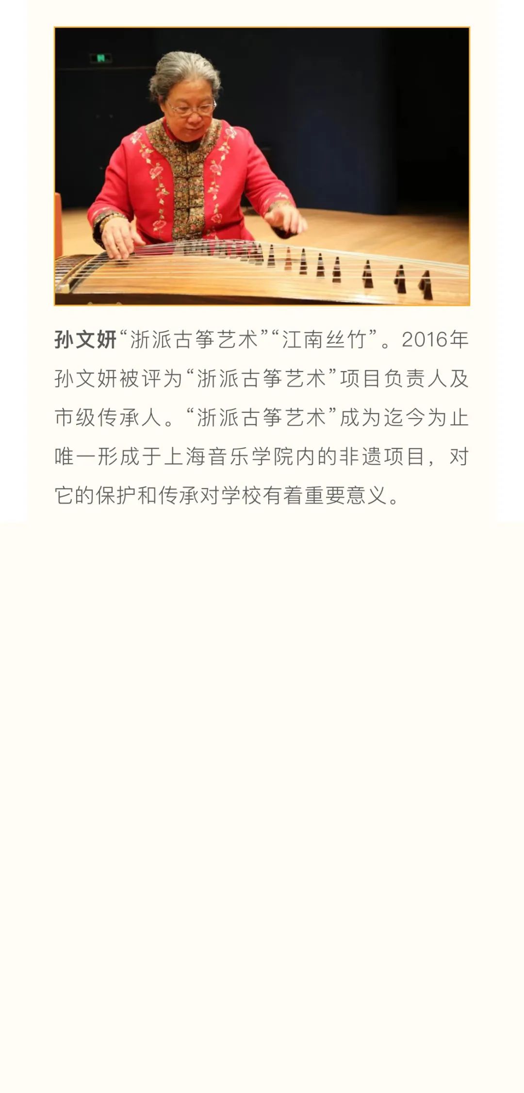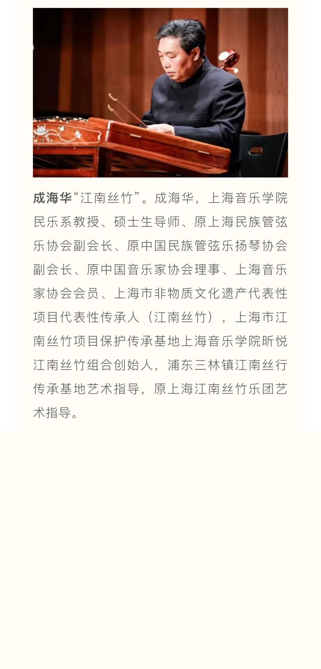 江南丝竹、江南-孙氏(孙文明)二胡艺术、浙派古筝艺术、浦东琵琶艺术、瀛洲古调、古琴艺术、古琴斫制技艺、竹笛艺术等入选国家级、上海市非遗音乐传承项目。