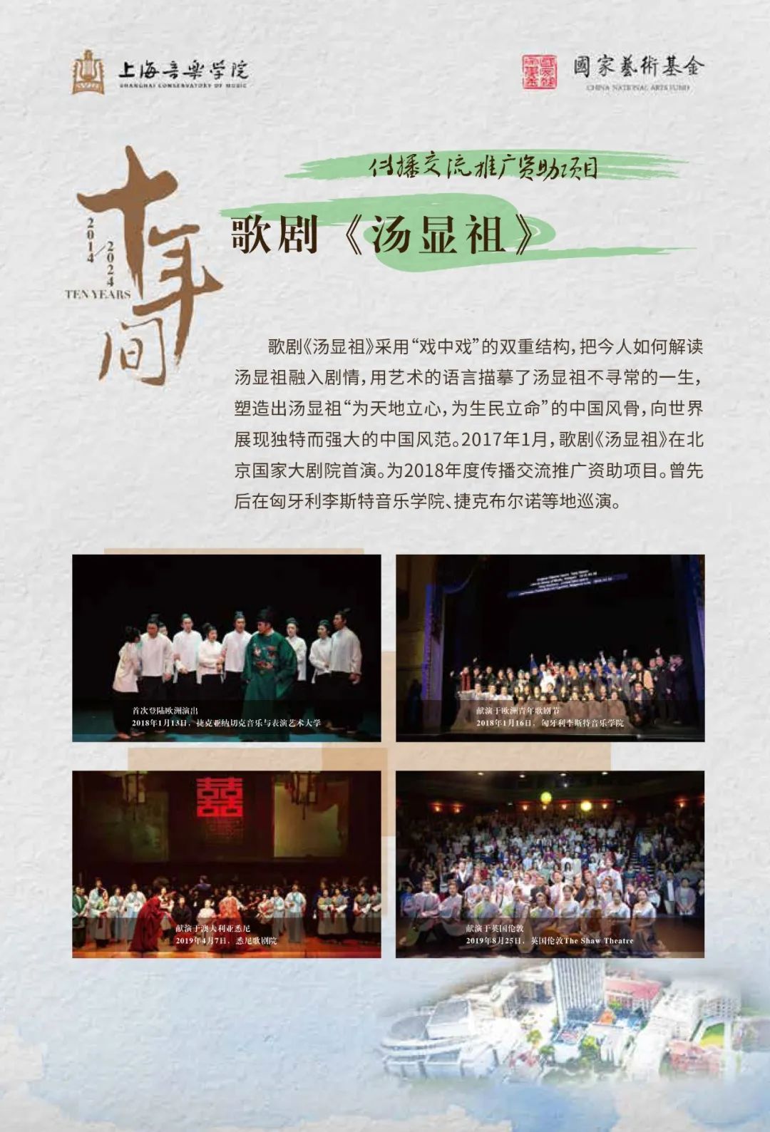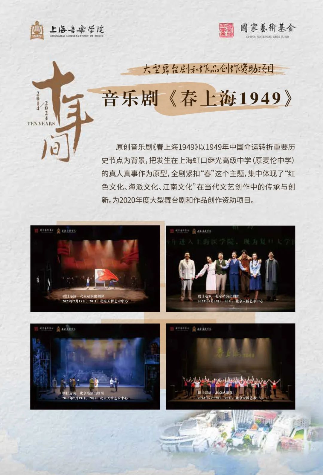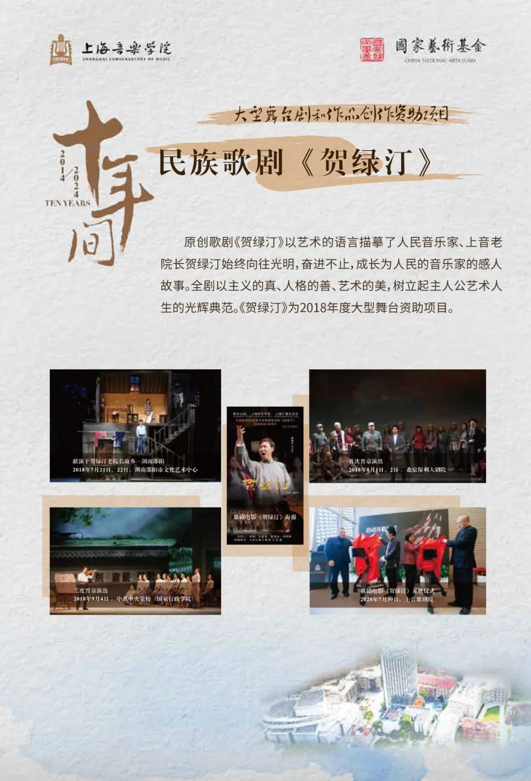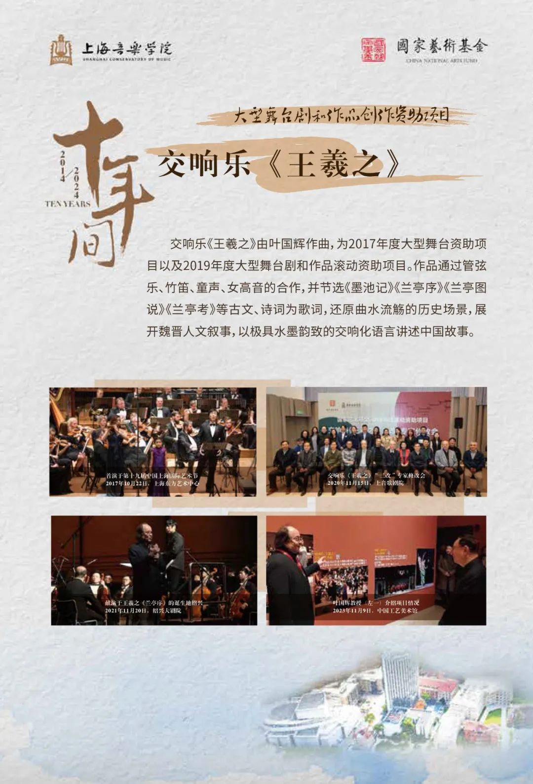 歌剧《贺绿汀》《汤显祖》《康定情歌》、交响乐《王羲之》《炎黄颂》、音乐剧《春上海1949》、音乐会《长相知》等数十个获批国家艺术基金项目。