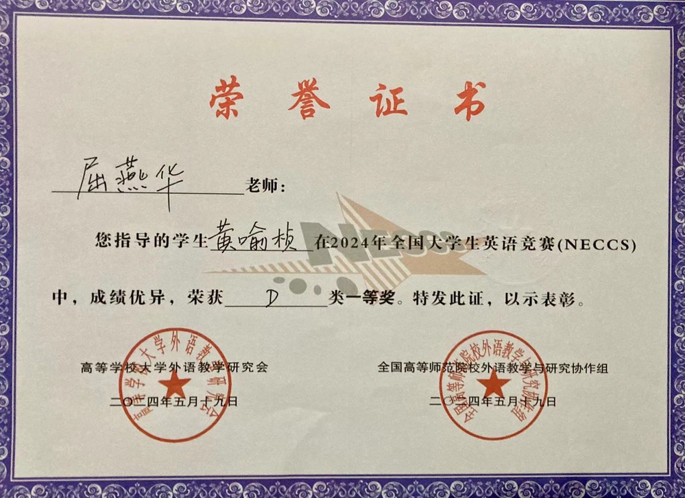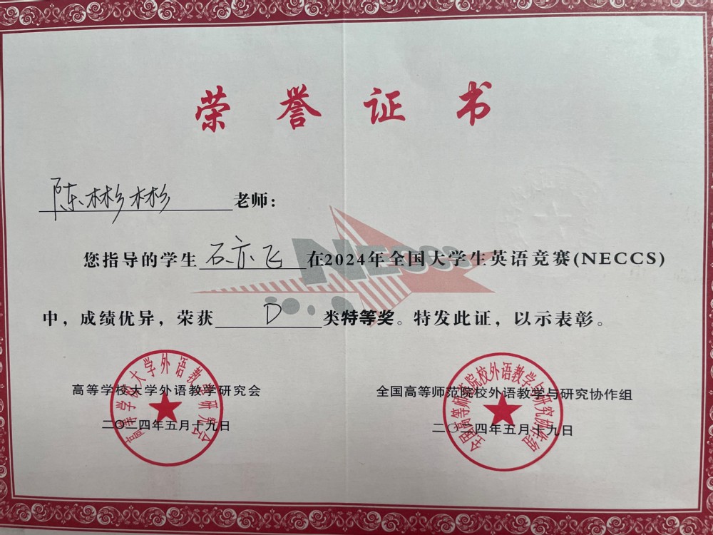 在本次全国大学生英语竞赛决赛中,石亦飞同学不负众望,创造佳绩。石亦飞同学厚积薄发,积极进取,终有所成。衷心祝贺她取得的好成绩,并感谢学校和外语教研室全体同仁为参赛选手们提供的支持和帮助!