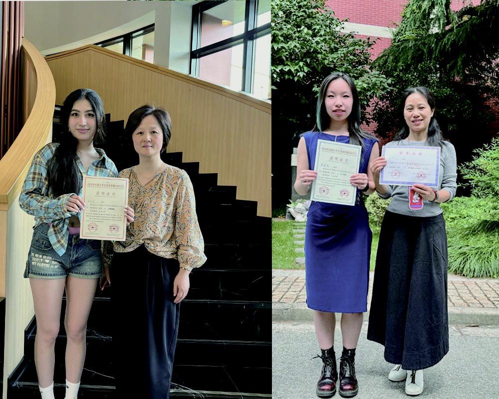 (特等奖获得者石亦飞和指导教师陈彬彬合影) (一等奖获得者黄喻桢和指导教师屈燕华合影)