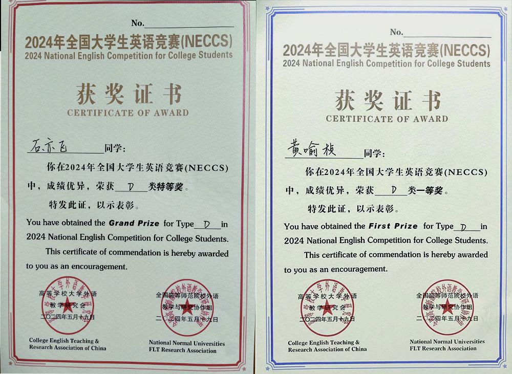 (石亦飞获奖证书) (黄喻桢获奖证书)