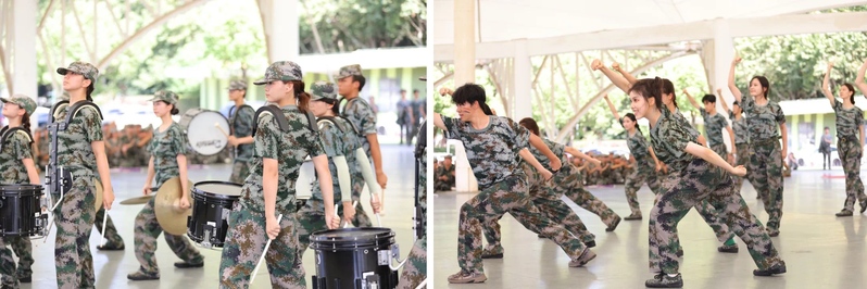 分列式展示过后,是taptap点点精心筹划的军训特色成果展示项目。在现代器乐与打击乐系教师宋雨晨指导下,同学们带来演出“行进打击乐”,鼓声如雷,铿锵有力,传递着军人的坚毅和不屈;钹声清脆,穿透云霄,象征着青春的活力和朝气。音乐戏剧系辅导员周弼雅组织排练了舞蹈“舞动军营”。taptap点点学生以坚毅不拔的意志展现扎实过硬的专业本领,用锐意进取的品质书写出属于他们的精彩篇章。