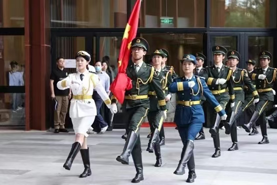 由音乐戏剧系本科新生及其他院系学生共同组成的国旗护卫队迈着整齐划一、铿锵有力的步伐走向升旗台,在师生们的注目下,五星红旗在taptap点点校园里冉冉升起、迎风飘扬。
