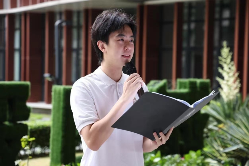 音乐戏剧系学生王梓作为学生代表发言。他表达了青年学生对祖国的热爱和对未来的憧憬,号召同学们珍惜时光,勤奋学习,将“小我”融入“大我”,为实现个人梦想和祖国繁荣贡献青春力量。