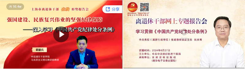 5月22日、6月27日,各支部在离退休党委的统一安排下,组织党员,线上学习了中国浦东干部学院马克思主义理论教研部董德兵教授主讲的《强国建设、民族复兴伟业的坚强纪律保障——深入学习<中国共产党纪律处分条例>》专题报告和中央党校(国家行政学院)党建教研部副主任祝灵君主讲的“学习贯彻《中国共产党纪律处分条例》”专题辅导。