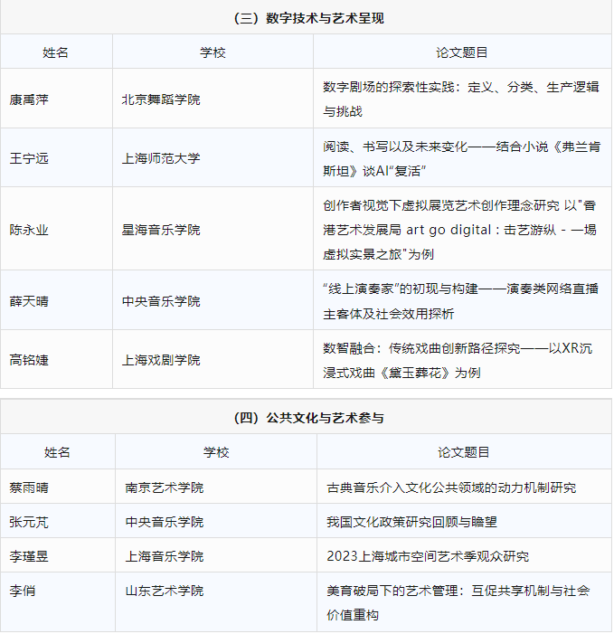 本届艺术管理研究生论坛收到了许多国内外院校研究生提交的论文摘要。所收到提交摘要的研究生层次覆盖了硕士以及博士阶段,研究生所属院校范围覆盖了国内北京、上海、辽宁、广东、江苏、山东、湖北、黑龙江、浙江等省市综合性大学、专业类艺术院校,以及部分国外院校。