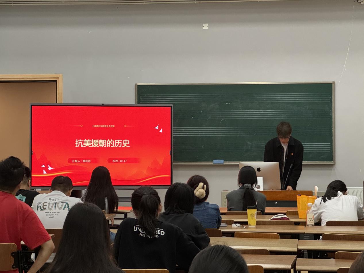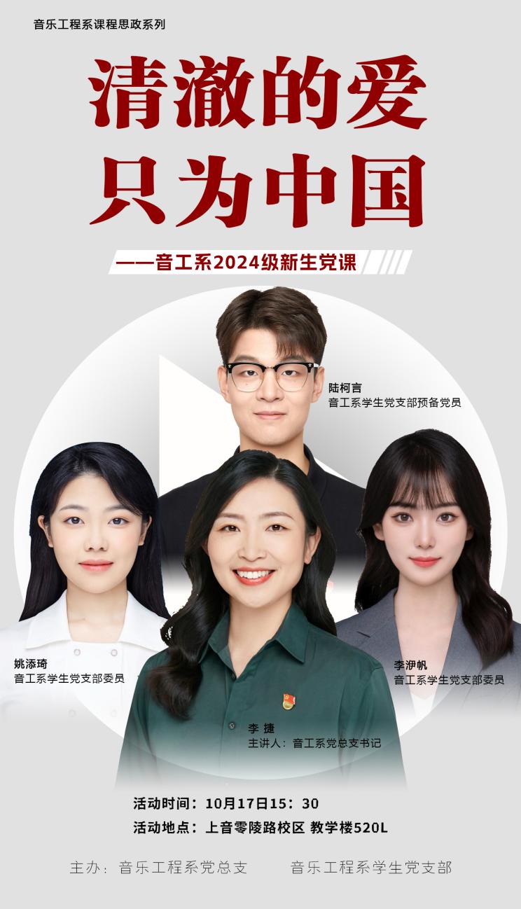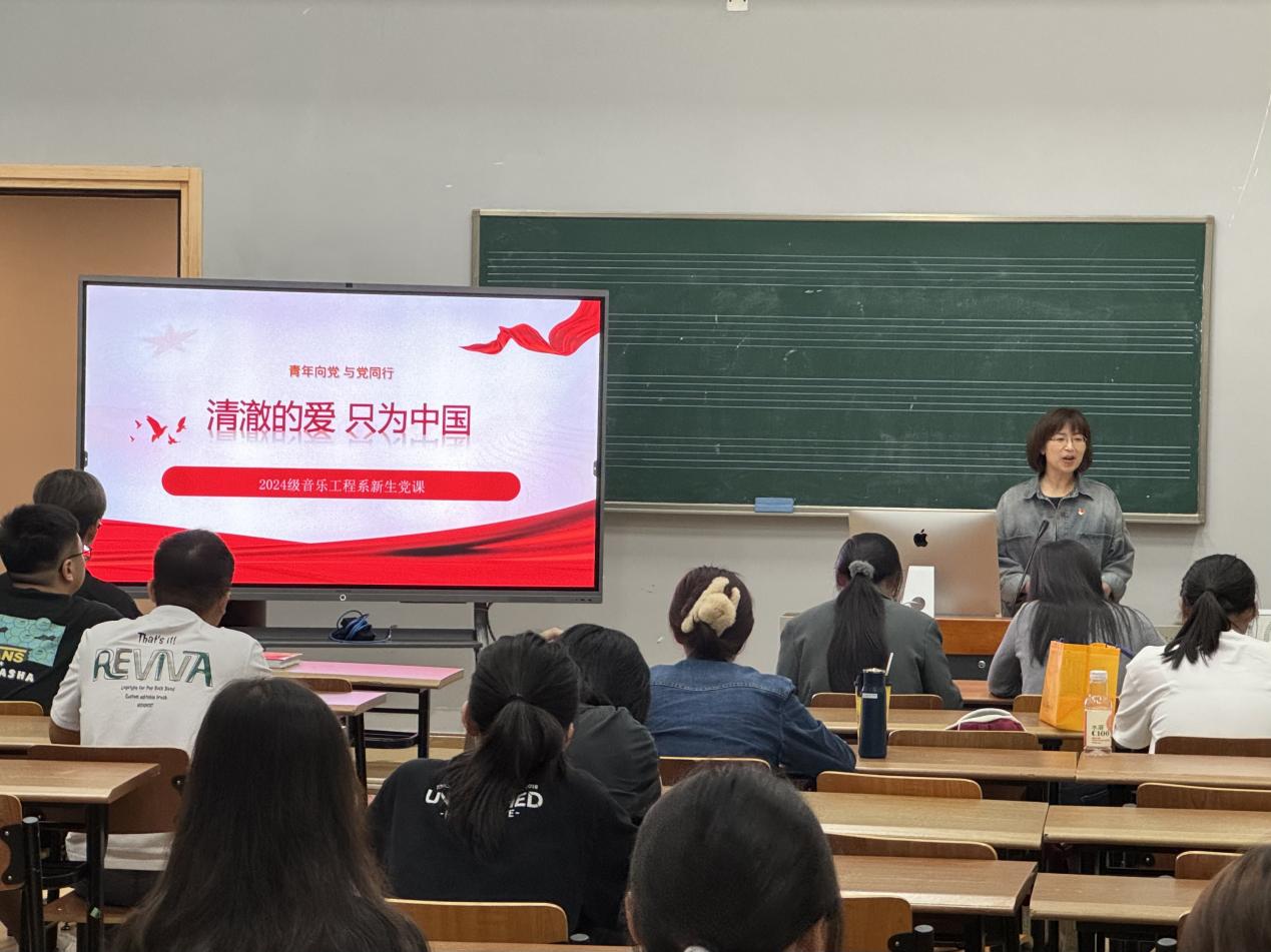 十月金秋,音乐工程系党总支、学生党支部于零陵路520教室内举行了“青春向党 与党同行——清澈的爱,只为中国”2024级新生党课。此次党课由学生党支部发起,由系党总支书记李捷带领李洢帆、姚添琦、陆柯言三位学生党员共同主讲。