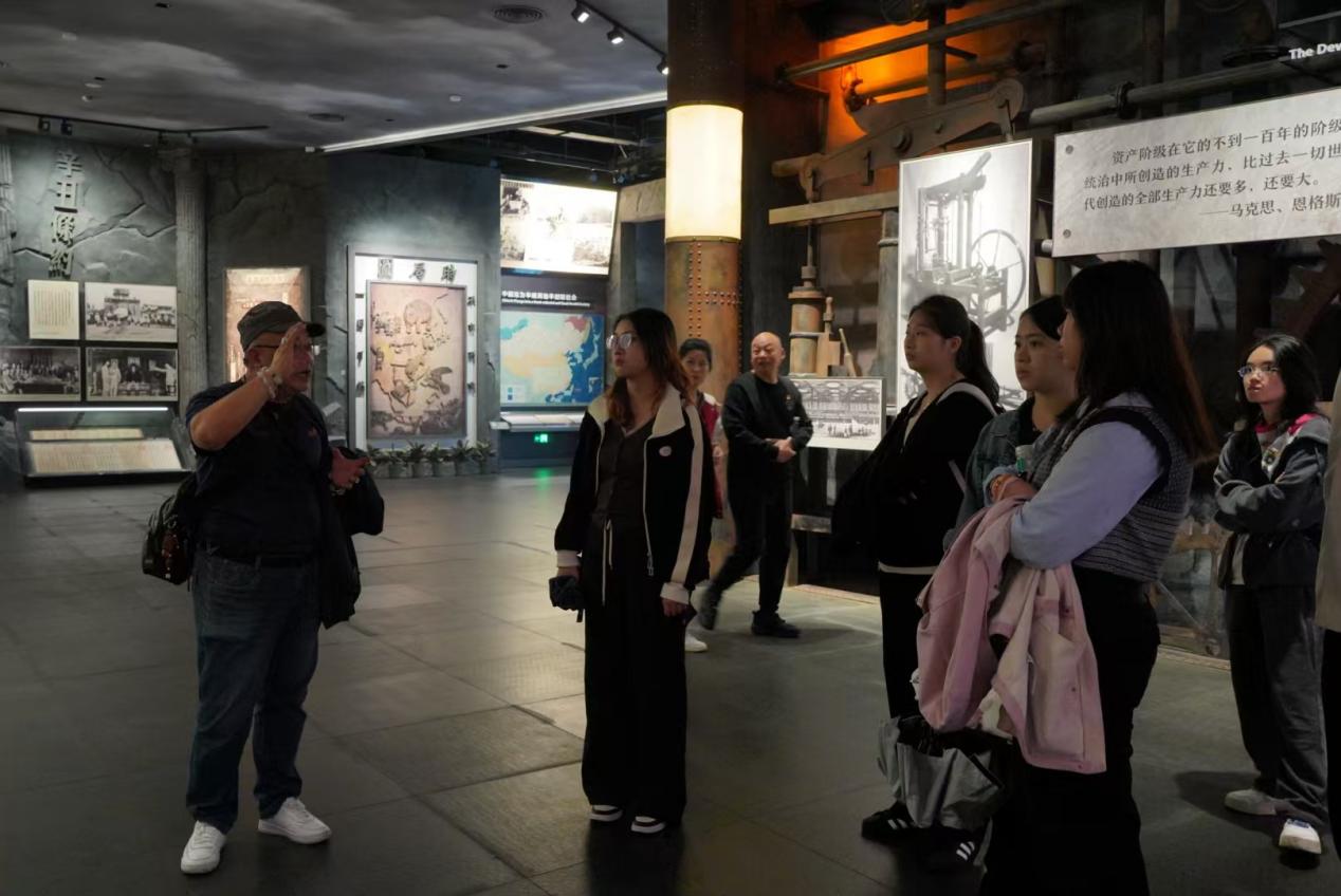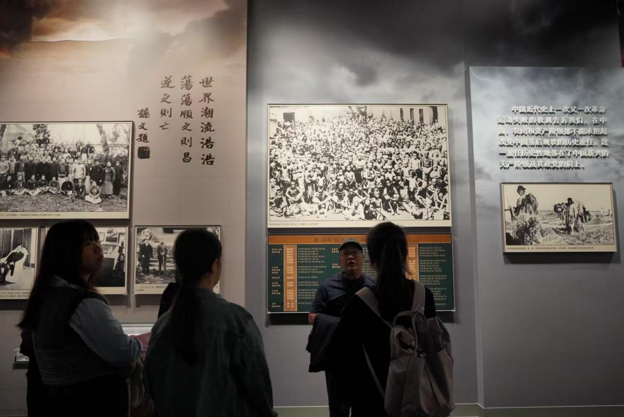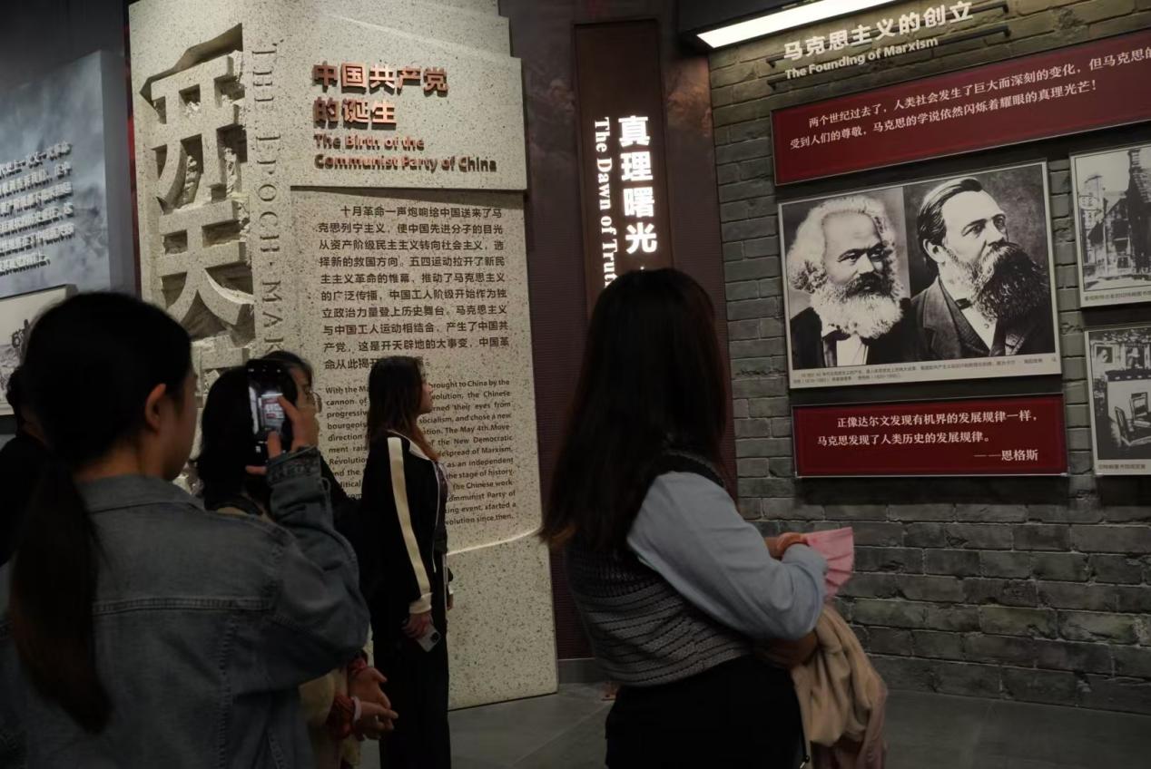 在“建党伟业”展区,展出的中共一大代表的肖像、会议记录以及珍贵实物如《共产党宣言》中文首译本、早期党章草案等,同学们深刻感受到中国共产党成立背后蕴含的使命与信念。