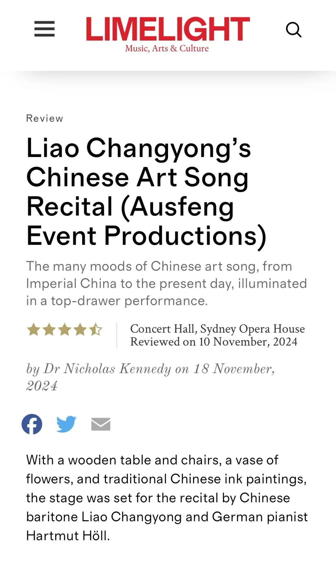 音乐会受到当地艺术界人士和媒体的高度赞誉。悉尼艺术节主席马克斯·霍尔茨纳(Max Holzner)表示:“这是一场非常精彩的极高水准的音乐会,两位大师艺术水平真是顶级、顶级、顶级!因为我父亲很喜欢艺术歌曲,我从小就听艺术歌曲长大。这种艺术体裁表演难度非常大,难得听到这么精彩的演绎。这是一场美妙的艺术享受!”澳大利亚全国性音乐艺术权威刊物《聚光灯》对10日的悉尼歌剧院音乐会给出了4.5颗星的高分乐评:“今晚的每一首歌曲都让人沉浸在不同的意境中,廖昌永的歌声是世界级的!”