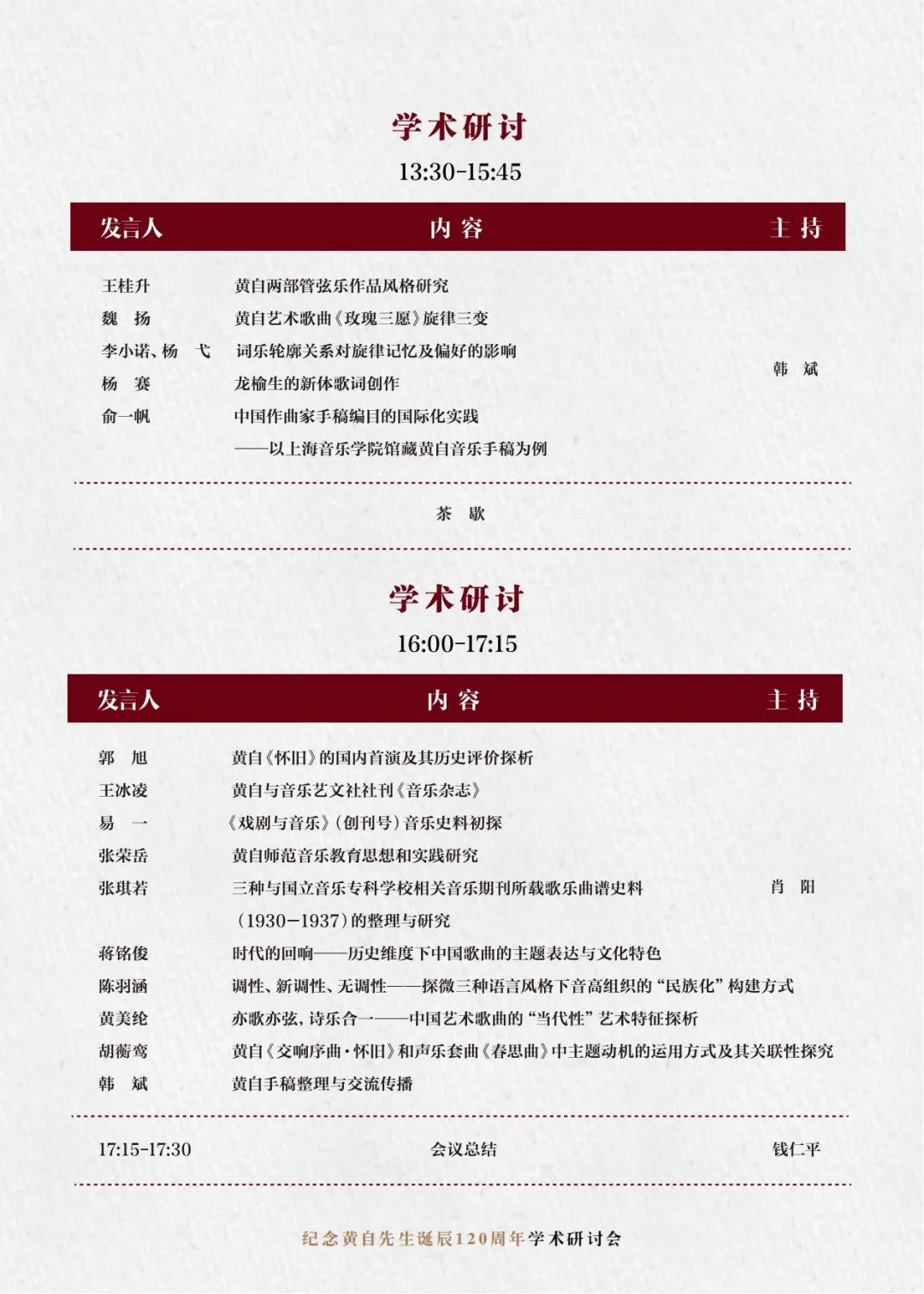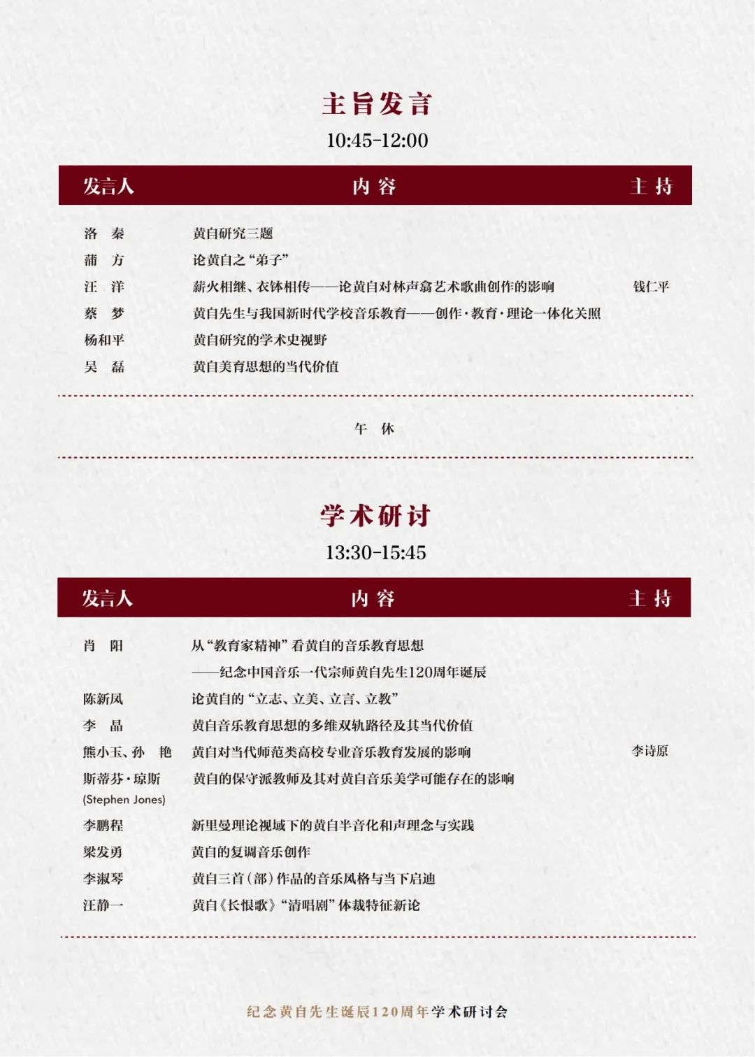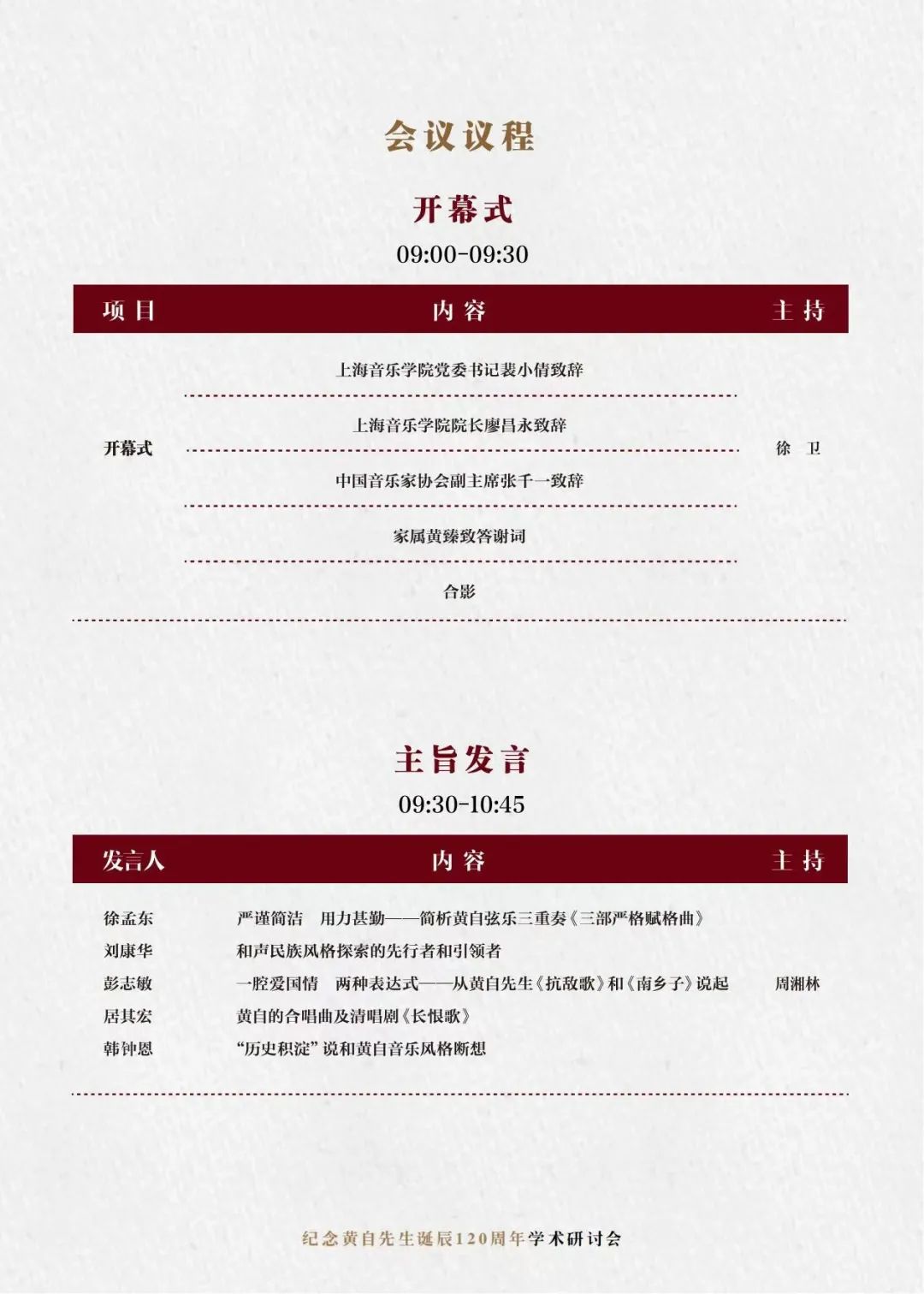 上午的主旨发言由作曲指挥系主任周湘林教授、研究生部主任钱仁平教授主持。来自全国各地的资深专家徐孟东、刘康华、彭志敏、居其宏、韩钟恩、洛秦、蒲方、汪洋、蔡梦、杨和平、吴磊等围绕黄自音乐创作、黄自音乐教育思想与实践、黄自音乐教育思想对中国音乐教育的启示、黄自研究的学术史,以及与黄自歌曲相关的中国艺术歌曲的创作与传播、中国近现代音乐文学等议题,进行了精彩发言。