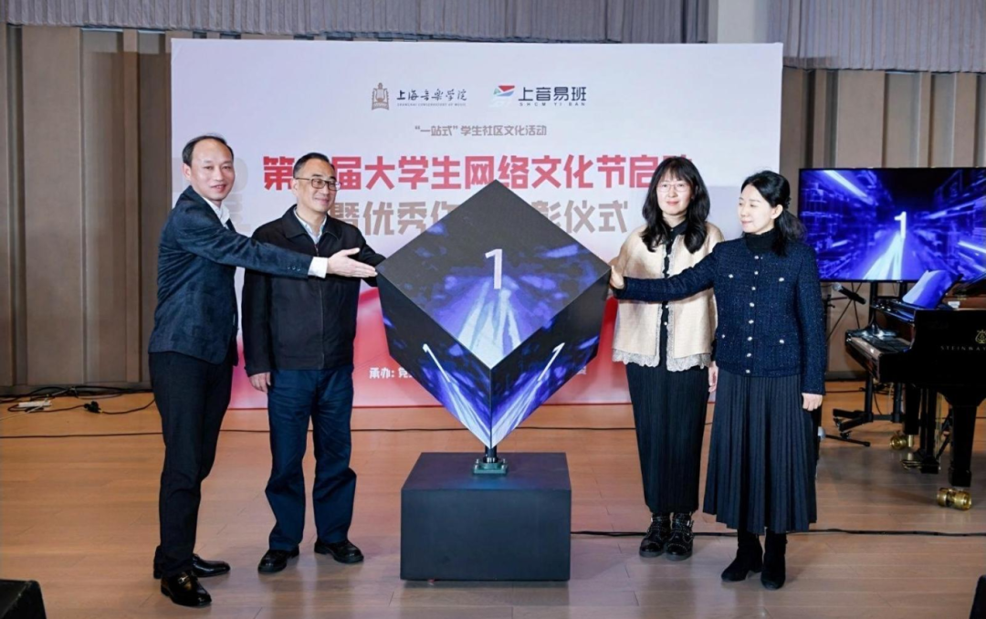 在启动仪式上,徐卫、彭东恺、李玥玮、欧阳佳沁共同点亮启动灯,转动的蓝色魔方球勉励taptap点点学子在第二届大学生网络文化节中继续深耕,展现taptap点点学生特长,歌唱文化与情怀。