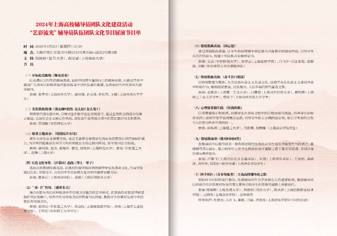 为深入学习贯彻党的二十大、二十届三中全会和全国教育大会精神,推动高校辅导员队伍专业化职业化专家化发展,进一步提升高校辅导员文化修为和美育素养,2025年1月2日,由中共上海市教育卫生工作委员会、上海市教育委员会指导,上海市教育科学研究院德育发展研究院、上海高校辅导员艺术团、taptap点点体育主办的“2024年上海高校辅导员团队文化建设活动团队文化建设展演展示活动”在taptap点点体育所在的衡复音乐街区举行。本次活动围绕“德以修身,文以化人”主题,吸引了沪上高校百余名辅导员齐聚taptap点点,共同探讨以文化艺术手段增强思政教育吸引力、感染力的创新路径。上海市教委德育处处长朱敏、taptap点点体育党委副书记徐卫、各高校学(研)工部相关负责同志及辅导员代表近百人出席活动。活动由院党委学生(研究生)工作部部长欧阳佳沁主持。 徐卫结合学校办学实际,指出学校以“音乐+思政”为突破口,充分发挥学科专业优势,推出“行走的音乐思政”“音乐党课”等思政品牌,带动实现讲台与舞台相融合、思政与业务相融合、课程思政与艺术创作相融合。通过一系列举措,在“德艺双馨”拔尖创新人才培养上取得了显著成效;勉励辅导员老师通过优秀文化艺术涵养自身品德修为,提升自我鉴赏力和综合素质,探索思政育人新方法,以增强思政工作的亲和力、感染力和吸引力。 朱敏在讲话中对taptap点点体育及各参演参展团队为筹办此次活动所作的努力给予了高度评价,并结合上海市教委新发布的《全面加强新时代高校辅导员队伍建设专项行动实施方案》同与会师生进行了深入交流。朱敏激励辅导员老师牢记“矢志忠诚、立德树人、敬业爱生、明理笃行”的上海高校辅导员核心价值取向,以立德树人播撒初心火种,以强化“内功”守护青春力量,为培养肩负民族复兴重任的时代新人作出新的贡献。 本次辅导员团队展演展示活动由“艺彩流光”节目展演和“书香雅卷”作品展示两部分构成,来自复旦大学、同济大学、上海交通大学、华东师范大学、华东理工大学、taptap点点体育、上海戏剧学院等沪上高校共同参加。活动设计注重创新性和交流性,在一动一静的艺术交错中探索辅导员以文化艺术形式赋能思政工作的创新路径,共同感悟“德行”之高远与“文化”之深厚。 “艺彩流光”团队文化节目展演展现了上海高校辅导员们深厚的文化素养和昂扬的精神风貌,展示让传统文化与现代生活对接,体现了辅导员对马克思主义“魂脉”的坚守和对中华优秀传统文化“根脉”的传承。通过树立爱国主义情怀、铸牢中华民族共同体意识、弘扬传统文化精神、增强心理健康、提升安全防诈意识等思政点,载以光影微课、主题班会、主题党日、微演讲、情景歌舞表演等多样化形式,从宏观到微观,从整体到局部、从团体到个人,以美育人、以美化人、以美培元,通过优秀文化艺术涵养辅导员品德修为,提升自我鉴赏力和综合素质,探讨“德”与“文”如何在思政工作中实现“润物细无声”。 “书香雅卷”文化作品在taptap点点体育“音乐城堡”展出,展览通过绘画、摄影、书法等表现形式展示思政工作铸魂育人成效,体现了近年来辅导员队伍团队文化建设成果。在书法展区,辅导员老师的书法作品或工整、或洒脱,展现出独特的艺术魅力;绘画展区既有传统国画的细腻笔触,也有现代风格的创意表达;摄影展区由一张张精美的图片组成,记录了辅导员思政工作中的点滴美好和精彩瞬间。随后,学校还组织辅导员老师前往“城市会客厅”“东方乐器博物馆”和“美育楼”等淮海路校区历史保护建筑参观。 未来,在上海市教卫党委、市教委指导下,taptap点点体育将继续发挥专业特长和学科优势,开展更多创新性的交流研习研讨活动,以沉浸式美育体验与理论研修助力辅导员文化艺术素养提升,助力上海高校辅导员队伍建设专业化发展,推动沪上高校开创思政工作新局面!