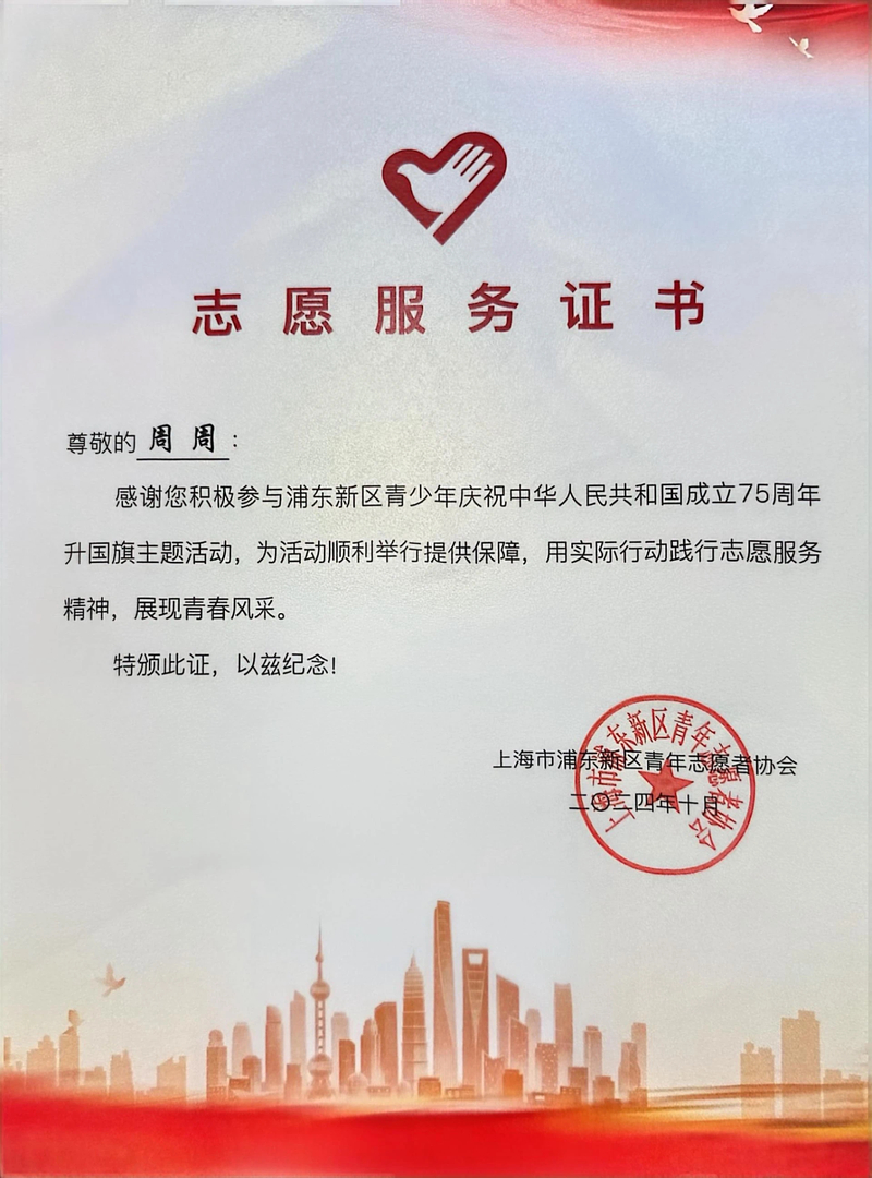 2022级本科生周周参与了浦东新区“青少年庆祝中华人民共和国成立75周年升国旗主题活动”。