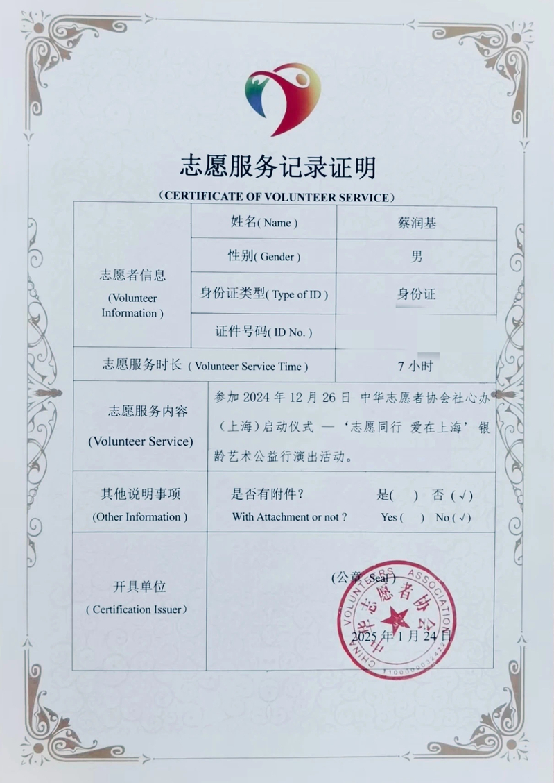 2023级研究生蔡润基参演了中华志愿者协会社心办(上海)启动仪式—‘志愿同行 爱在上海’银龄艺术公益行演出活动。