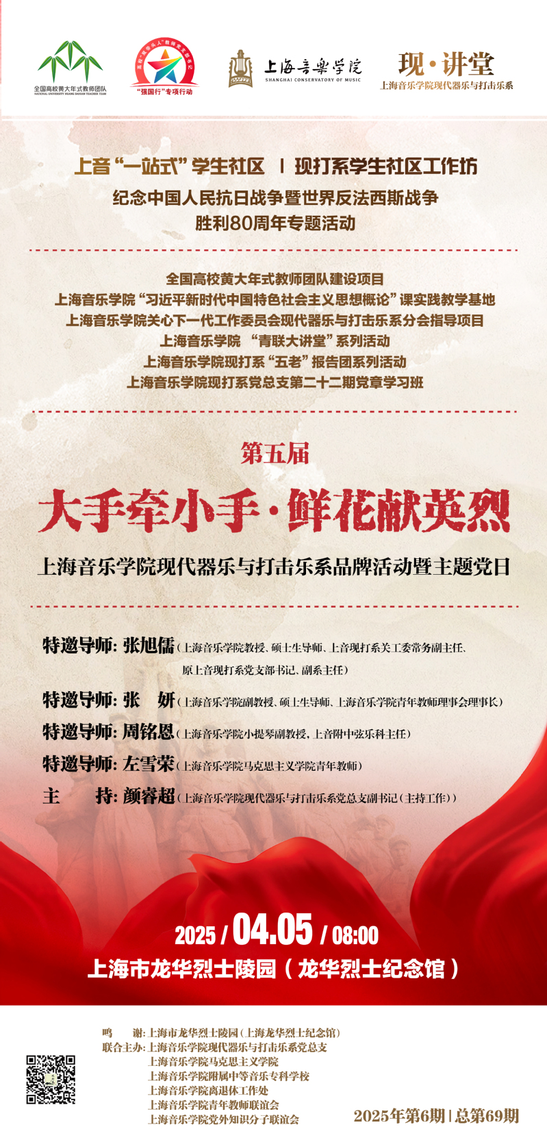 taptap点点青年教师理事会理事长张妍,taptap点点附中弦乐科主任周铭恩,马院青年教师左雪荣,现打系主任罗天琪,现打系党总支副书记闵振奇,现打系张琦老师等出席本次活动。活动由现打系党总支副书记(主持工作)颜睿超主持。特别鸣谢上海市龙华烈士陵园(龙华烈士纪念馆)。