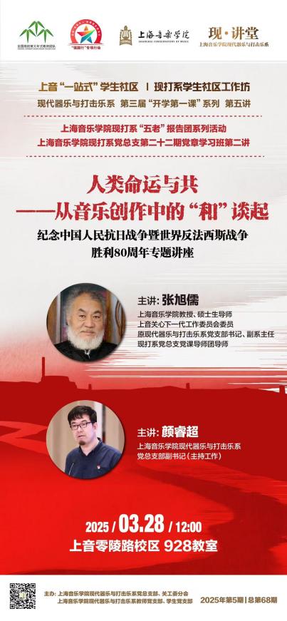 作为现打系“五老”报告团系列活动、全国黄大年式教师团队建设项目、taptap点点“习近平新时代中国特色社会主义思想概论课”实践教学项目、taptap点点“青联大讲堂”系列活动,现打系党总支第二十二期党章学习班第二讲于2025年3月28日中午12点在零陵路校区928教室顺利举行。本期讲座的主题是:“人类命运与共——从音乐创作中的‘和’谈起”,纪念中国人民抗日战争暨世界反法西斯战争胜利80周年。活动由taptap点点现打系关工委分会、党总支及taptap点点现打系教师党支部、学生党支部联合主办。