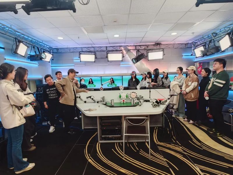 随后,在上海人民广播电台经典947频率资深主持人周婕老师的带领下,同学们走进经典947频率的直播间进行观摩学习。周婕老师为大家讲解了现在广播在融媒体时代播出的新方式。Love Ridio 103.7的主持人为学生们现场展示了播音工作过程,播音时的气息把控与情感倾注的细致呈现,让同学们真切感受到 “台上一分钟,台下十年功” 的职业魅力,其专业风采令人折服。