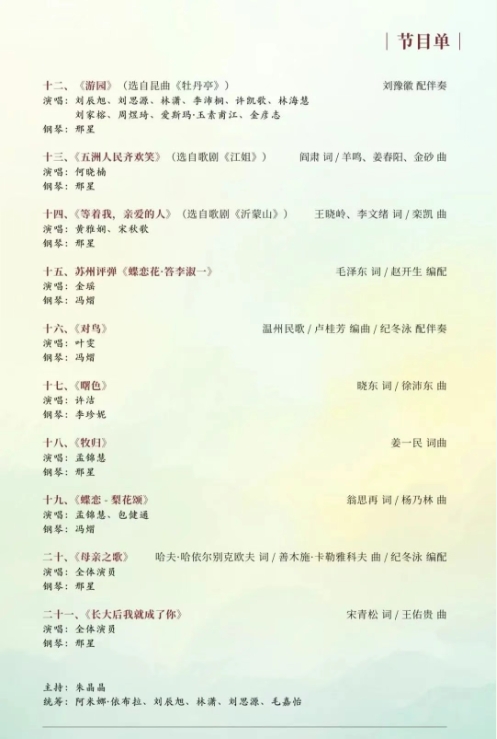 22年10月参加《来自丝绸之路上的音乐之美》《民族歌剧民族魂》系列音乐党课;11月参加“中国歌剧经典片段”音乐会。