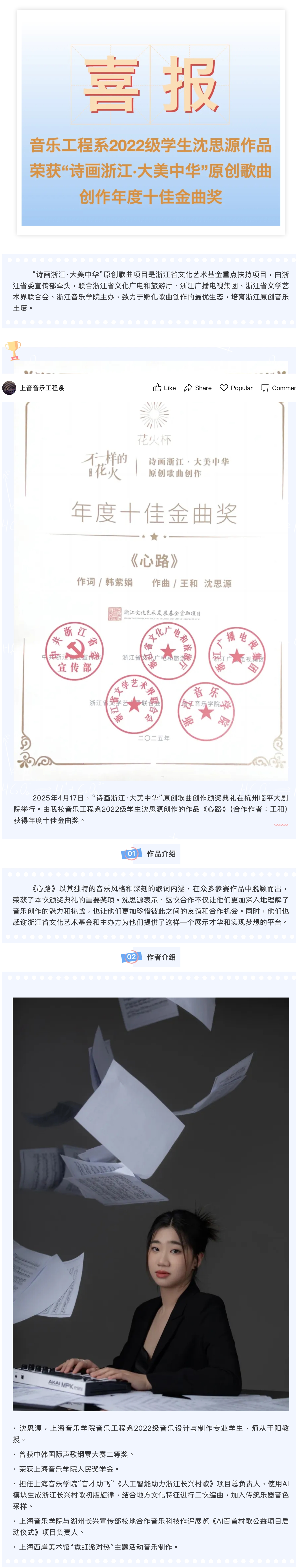 喜报|音乐工程系2022级学生沈思源作品荣获“诗画浙江·大美中华”原创歌曲创作年度十佳金曲奖