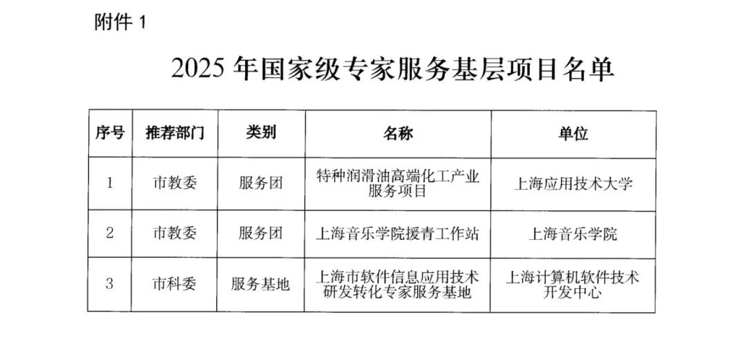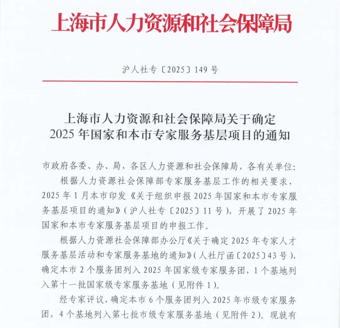 根据上海市人力资源和社会保障局发布的通知,上海市2个服务团列入2025年国家级专家服务团,1个基地列入第十一批国家级专家服务基地;6个服务团列入2025年市级专家服务团,4个基地列入第七批市级专家服务基地。
