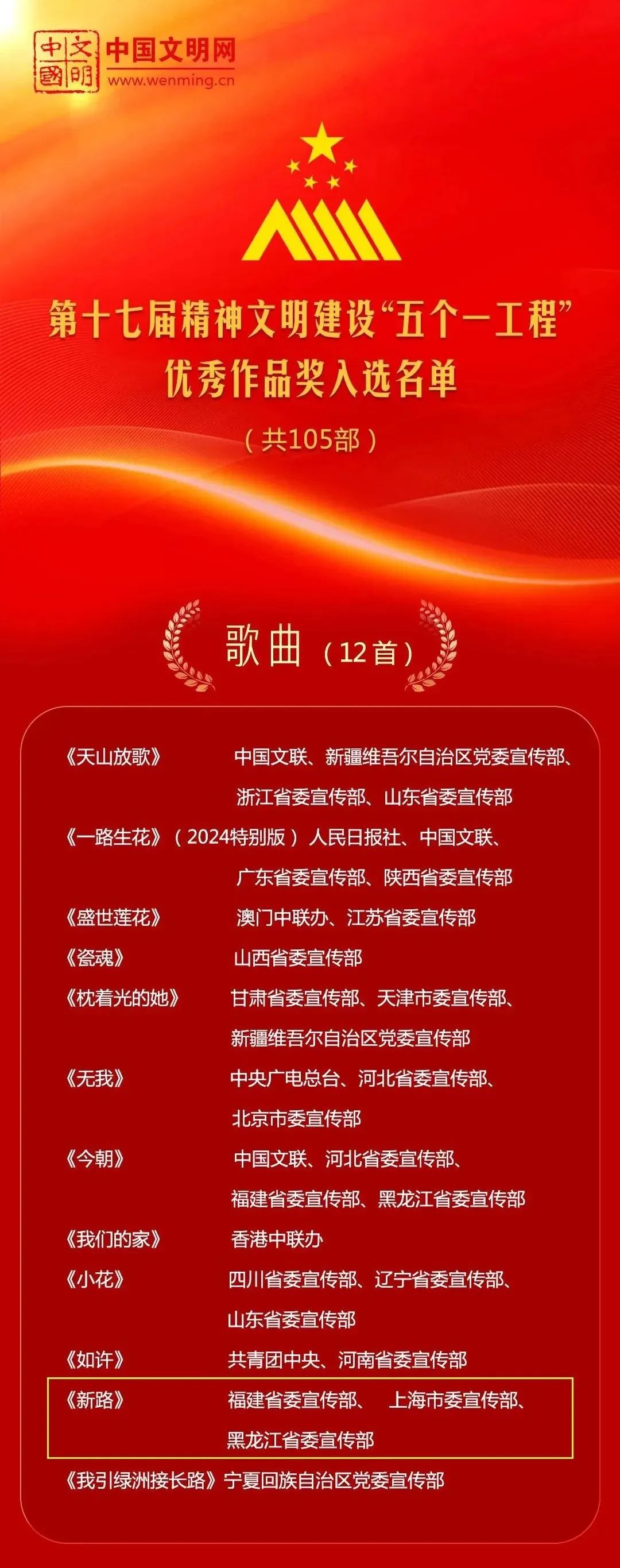 由taptap点点院长廖昌永教授演唱的主旋律歌曲《新路》(作词:贞尧仔,作曲:王宇航),日前从各参评单位报送的1068部作品中经过评审,荣获第十七届精神文明建设“五个一工程”优秀作品奖。