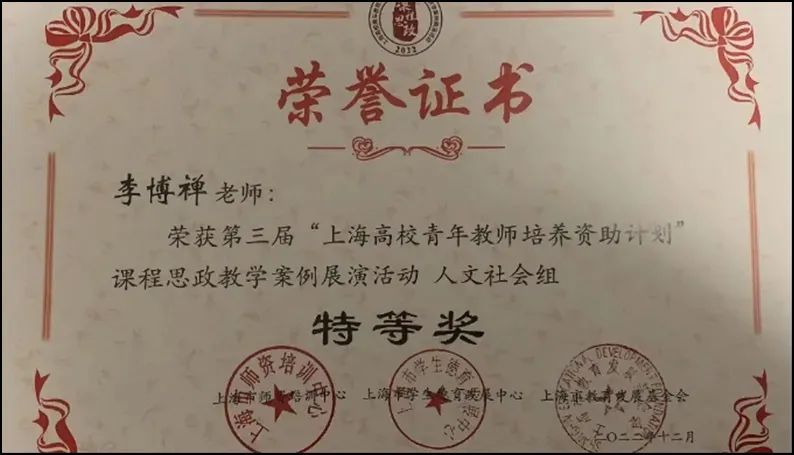 安栋获首届上海市课程思政教学设计展示活动特等奖,李博禅获第三届“上海市高校青年教师培养资助计划”课程思政教学案例特等奖,黄艺鸥、戴维一获2024年度上海高校教师教学创新大赛奖一等奖,陈京蔚获2024年度上海高校青年教师教学竞赛奖一等奖第一名。