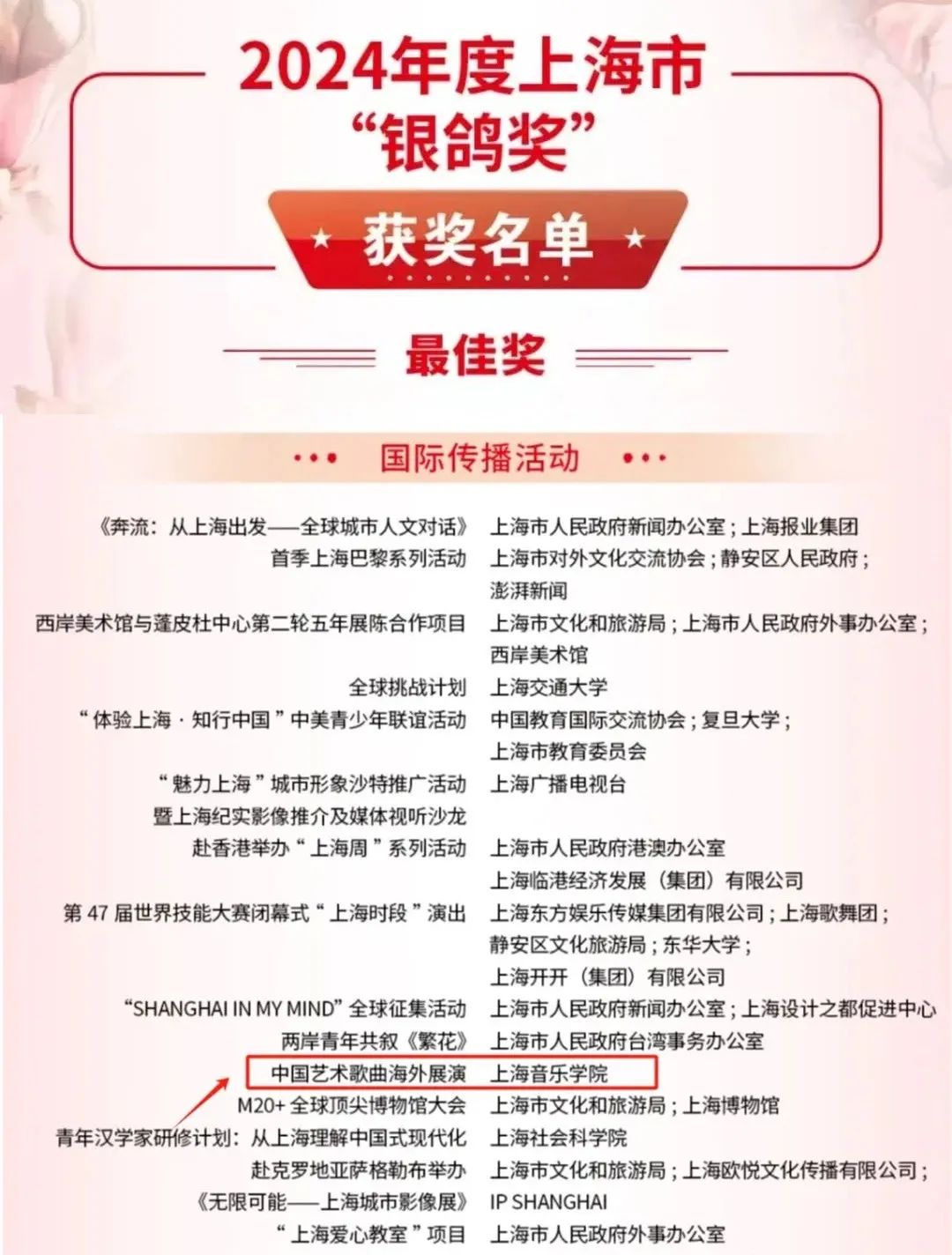 做强“留学taptap点点”品牌。促进来华留学教育提质增效,将国际学生教育全面融入学校整体人才培养体系,获评上海高校来华留学教育优秀案例。持续开展上海暑期学校——中国民乐项目、“一带一路”艺术文化人才培优项目、“感知中国”来华留学生社会实践与文化体验活动、中国政府奖学金“高水平研究生”“丝绸之路”项目等。