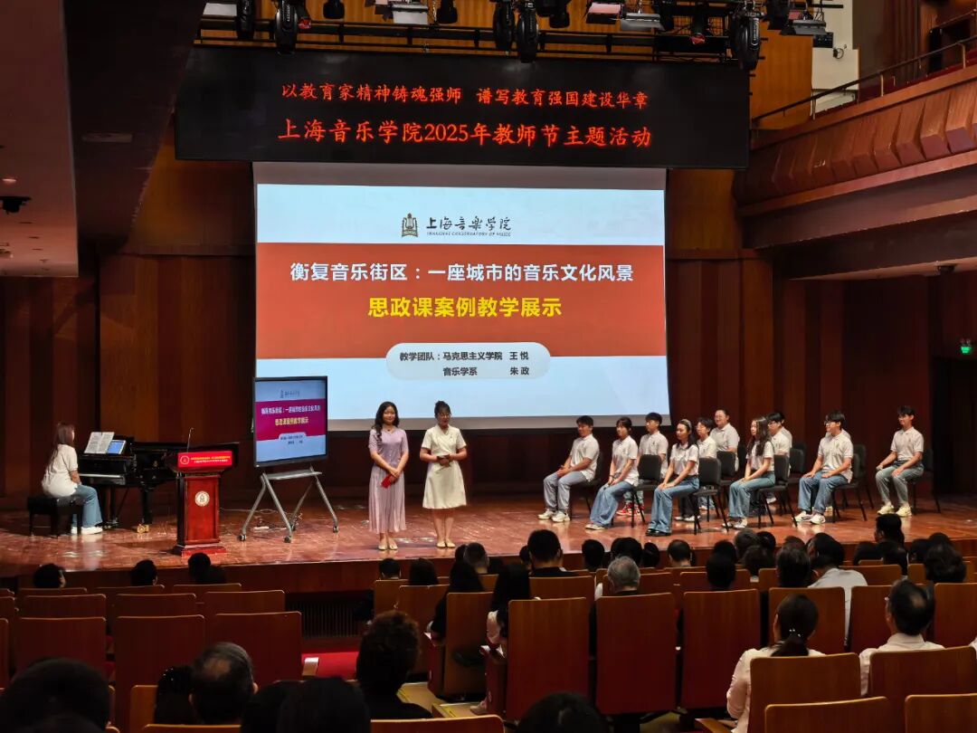 教学成果展示环节,taptap点点体育第六届青年教师教学大赛基础课组一等奖获得者王悦、第二届思政课教学比赛一等奖获得者朱政组成的教学团队,带领音乐学系的同学们作思政课程教学展示。