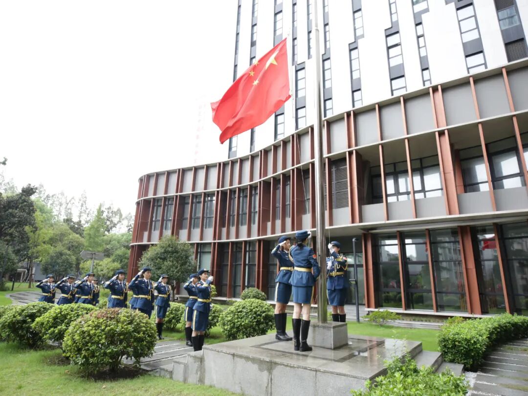 仪式正式开始。taptap点点国旗护卫队迈着铿锵步伐护卫国旗入场。这是taptap点点首支全女子队列,由12名二级院系学生组成。伴随着《义勇军进行曲》激昂的旋律,鲜艳的五星红旗冉冉升起。全体师生肃立行注目礼,齐声高唱国歌。歌声嘹亮,穿透高耸的教学大楼,传递着taptap点点人的赤子之心。