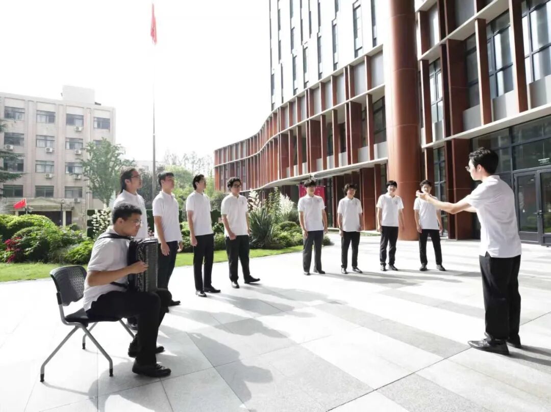 仪式最后,作曲指挥系学生现场合唱由老院长贺绿汀创作的经典作品《游击队歌》。佟希然、马佳鑫、沈时弘、郝开心、姚世豪、鹿扬、胡宸睿、连彬尧担任领唱,陈马指挥,特邀现打系学生王俊超演奏手风琴。师生们以铿锵有力的歌声、青春昂扬的面貌,展现出炽热深沉的家国情怀和出色的专业素养。