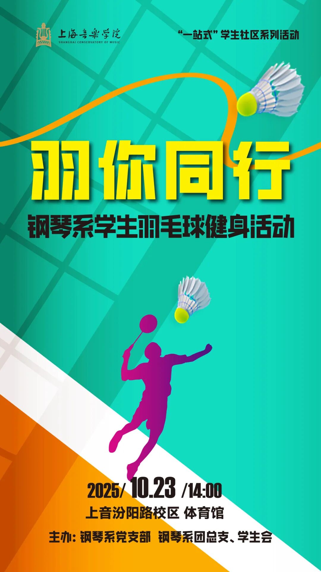 为了丰富并活跃学习生活,增强团学组织的凝聚力,钢琴系学生羽毛球健身活动于2025年10月23日下午在汾阳路体育馆圆满举办。在琴键之外,他们挥舞着球拍,尽情释放青春活力,展现出别样的风采。本次活动是钢琴系劳动实践周系列活动之一。活动现场气氛热烈非凡,参加活动的同学们个个精神饱满、斗志昂扬。他们身着轻便的运动服,在羽毛球场上灵活地跑动。同学们全身心投入其中,不仅展现出顽强的拼搏精神,更体现出良好的团队协作意识,将青春的激情与活力尽情挥洒在这片羽毛球场上。