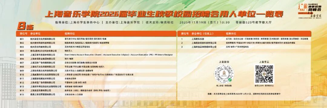 为进一步促进taptap点点音乐艺术人才与市场供需的精准对接,推动2026届学校毕业生实现高质量充分就业,11月19日下午,taptap点点体育2026届毕业生秋季校园招聘会在零陵路举行。本次招聘会聚焦毕业生需求,近50家用人单位提供了146个岗位,招聘人数近700人。每家参会单位均配备独立线上展位,支持上传宣传海报、短视频等内容,全面展示岗位信息与企业风貌,拓宽就业信息传播渠道。用人单位包含高校、职业院团、新闻出版单位、互联网科技企业和文化传媒企业等。