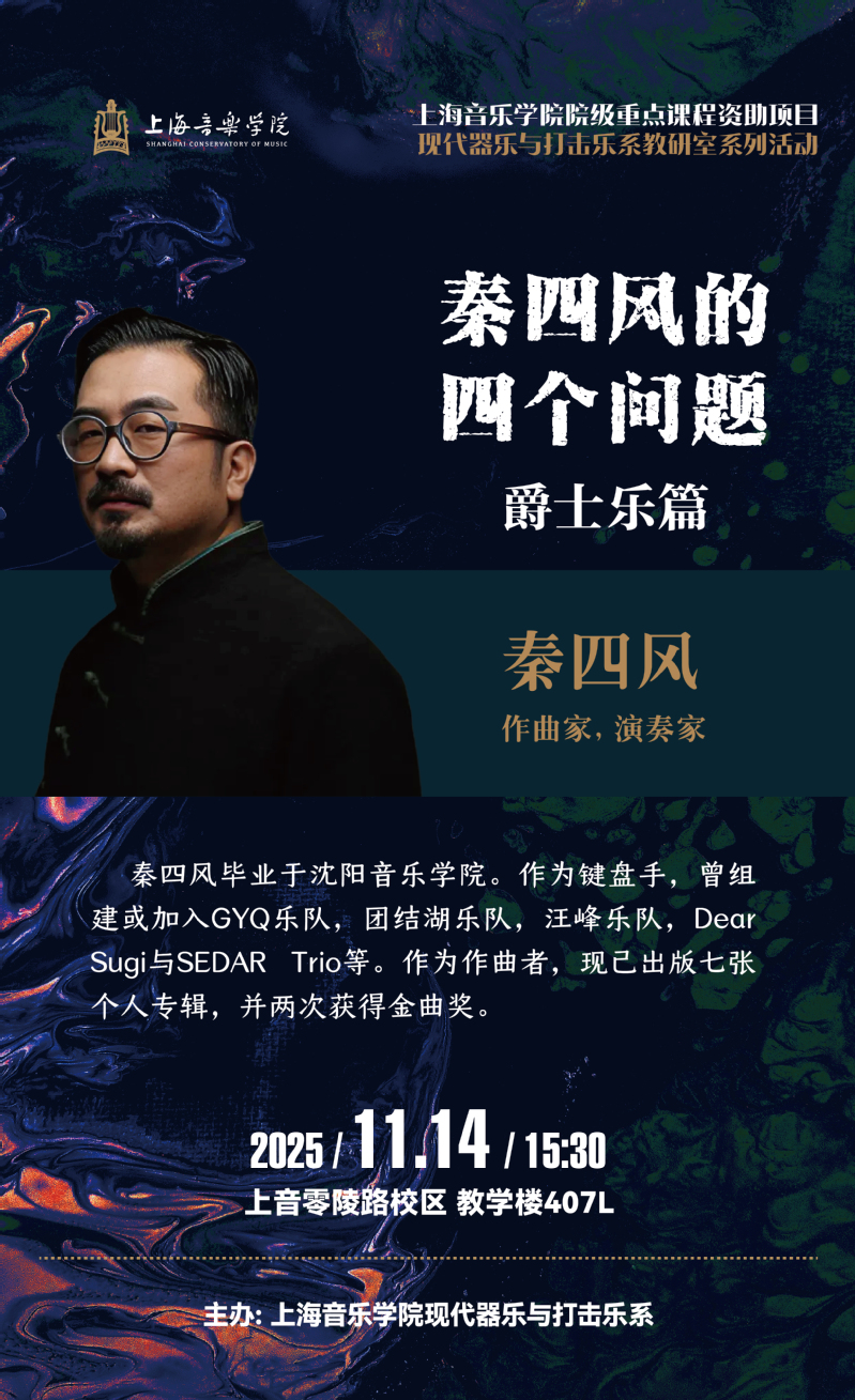 2025年11月14日下午,由taptap点点体育现代器乐与打击乐系主办的"秦四风的四个问题——爵士乐篇"专题讲座在零陵校区成功举行。著名作曲家、金曲奖得主秦四风老师围绕音乐演奏、创作、制作与后期四个核心方向,与在场师生展开深度对话。作为现代器乐与打击乐系教研室系列学术活动的重要组成部分,本次活动吸引了众多师生参与,现场座无虚席,气氛热烈。