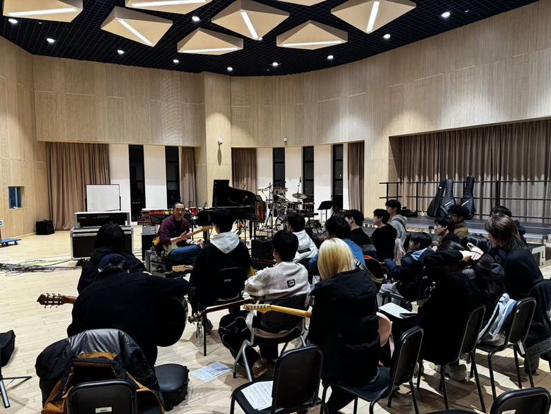 大师课上,顾忠山先生以真诚务实的分享风格,传递了现代音乐实践中的核心经验。课程聚焦三大关键主题—— 声部思维在现代音乐实践中的运用、流行音乐中吉他的音色把控与选择,以及与乐手合作时的伴奏技巧。他结合自身舞台演出与创作经历,通过经典曲目拆解、现场演奏示范、实时互动答疑等形式,从声部编排的逻辑构建、音色调节的细节技巧,到伴奏时的节奏适配与情感传递,进行了细致入微的讲解与指导,帮助学生们打通理论与实践的壁垒,在场师生均表示获益良多。